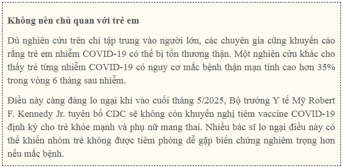 Giáo sư Yong Chen, Giám đốc Trung tâm AI và Tổng hợp bằng chứng Y tế tại Đại học Pennsylvania (Mỹ), nhận định: "Mức độ tổn thương thận tỷ lệ thuận với mức độ nghiêm trọng của bệnh. Những người chỉ có triệu chứng nhẹ hoặc không có triệu chứng hầu như không bị tổn thương thận đáng kể".