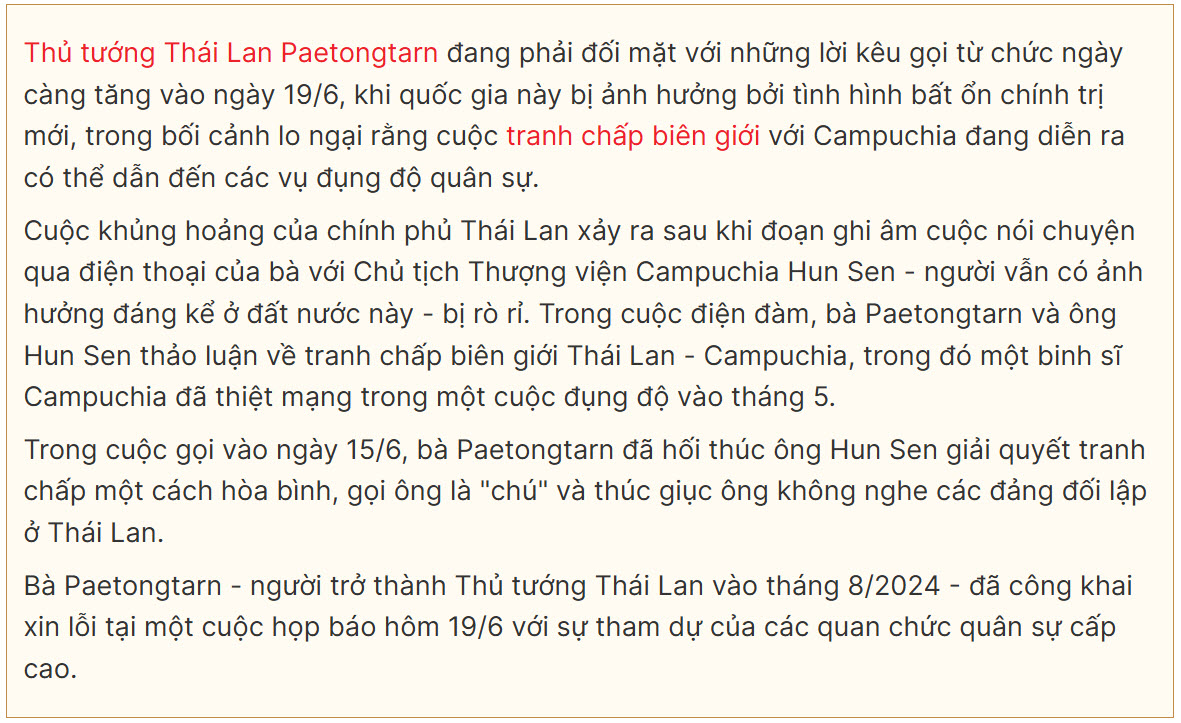 Thủ tướng Thái Lan Paetongtarn đang phải đối mặt với những lời kêu gọi từ chức ngày càng tăng.