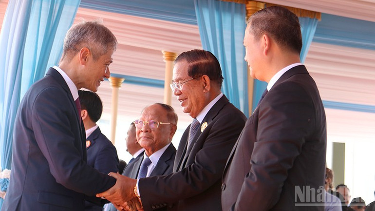 Đại sứ Việt Nam tại Campuchia Nguyễn Minh Vũ chúc mừng lãnh đạo cấp cao CPP nhân kỷ niệm 74 năm Ngày thành lập đảng.