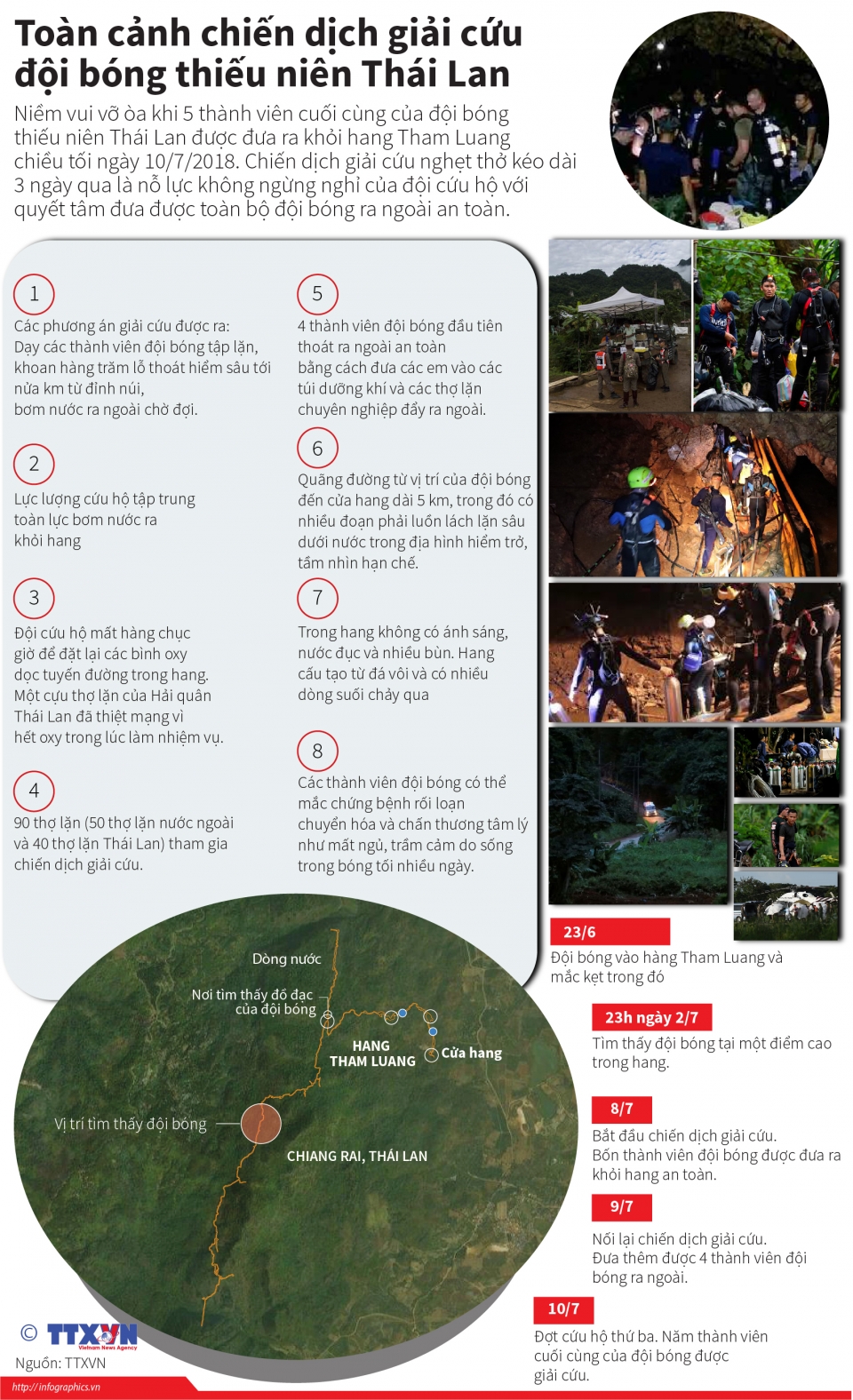 Chiến dịch giải cứu kéo dài nhiều ngày qua đã thành công khi các thành viên cuối cùng của đội bóng thiếu niên Thái Lan được đưa ra khỏi hang chiều tối ngày 10/7.