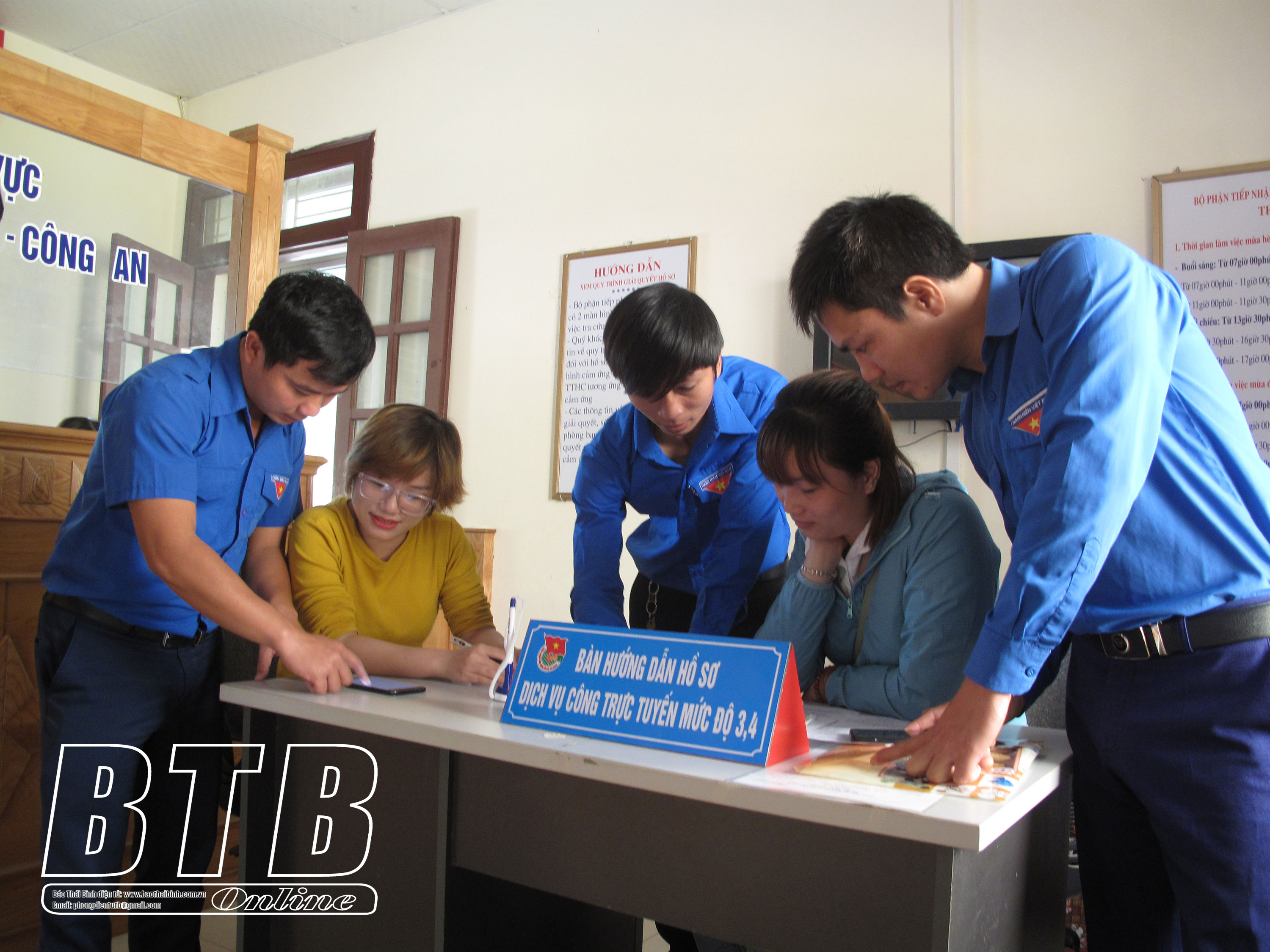 Đoàn viên huyện Thái Thụy hướng dẫn người dân tư vấn hướng dẫn về nộp hồ sơ trực tuyến.