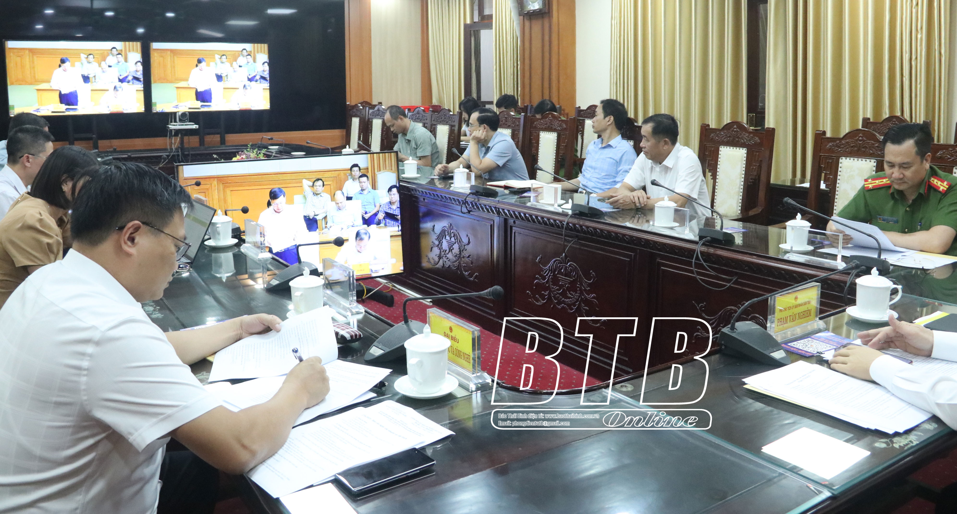 Đồng chí Phạm Văn Nghiêm, Tỉnh ủy viên, Phó Chủ tịch UBND tỉnh, Phó Trưởng ban Thường trực Ban Chỉ đạo của UBND tỉnh chủ trì cuộc họp tại điểm cầu Thái Bình.