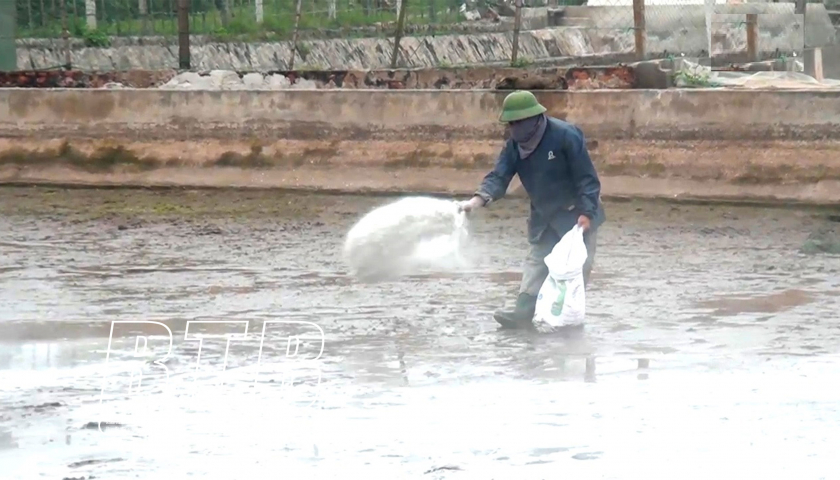 Hộ nuôi trồng thủy sản rắc vôi bột diệt khuẩn chuẩn bị cho vụ nuôi mới.