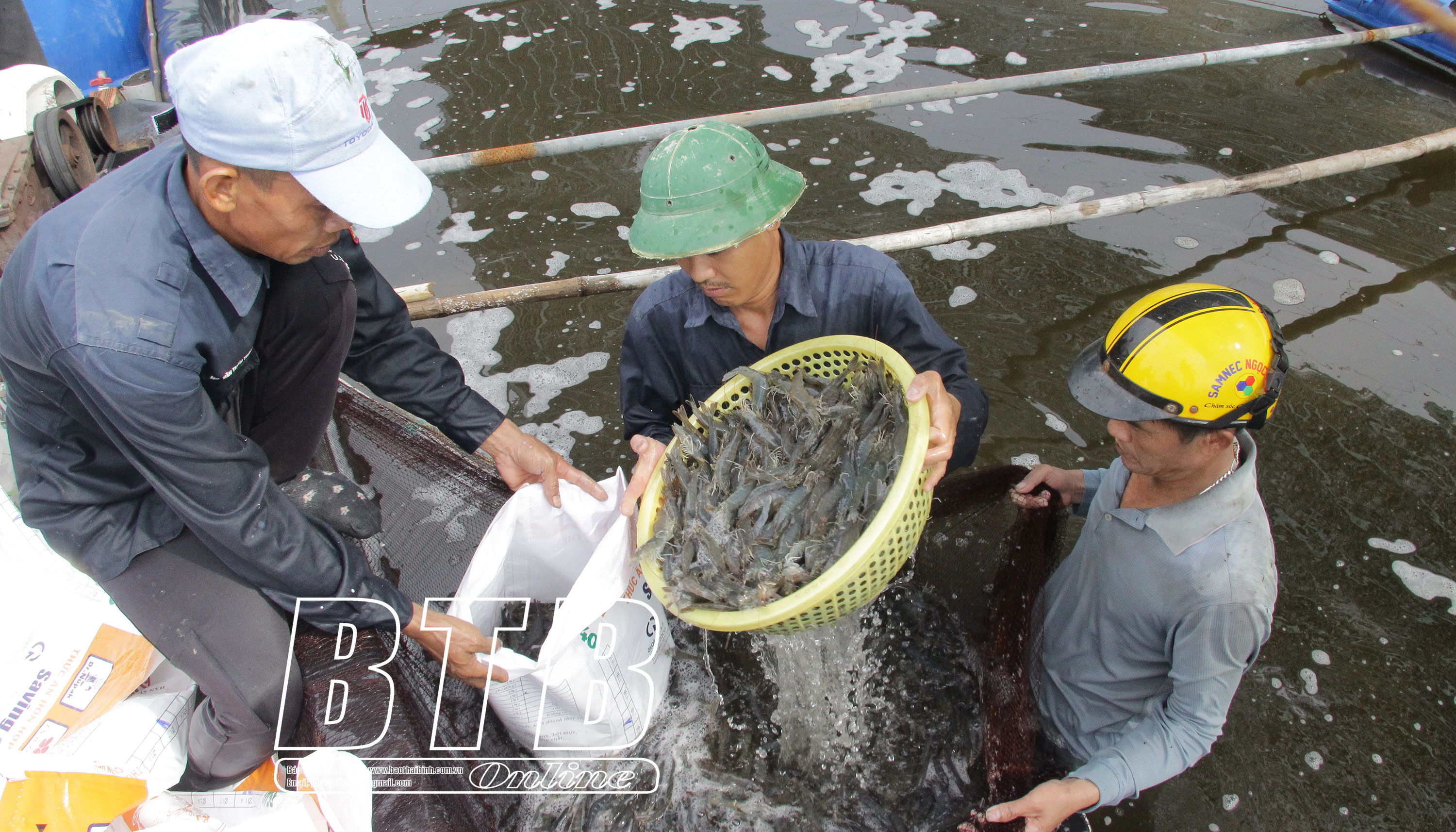 Thu hoạch tôm tại mô hình công nghệ cao của hộ dân xã Nam Phú (Tiền Hải).