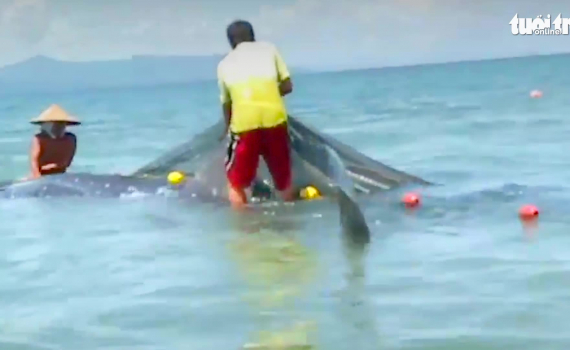 Giải cứu cá nhám voi mắc vào lưới đánh cá của ngư dân