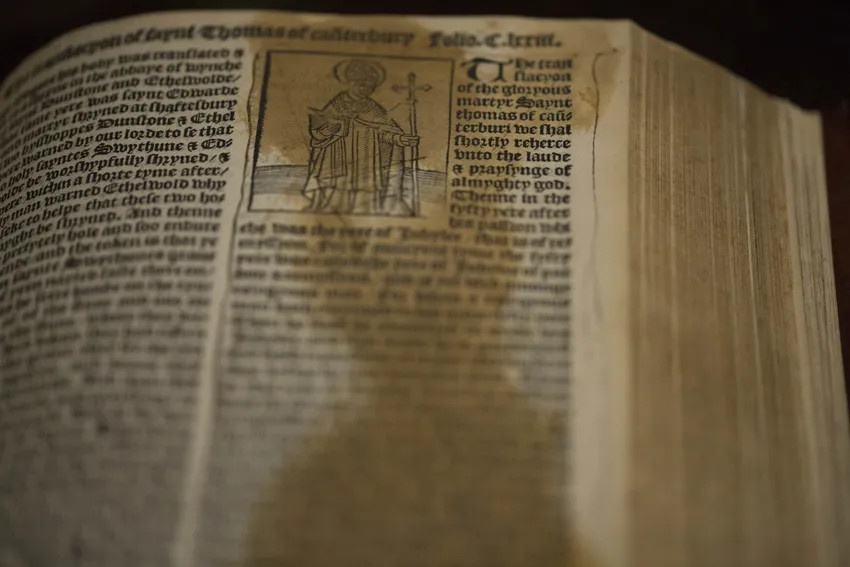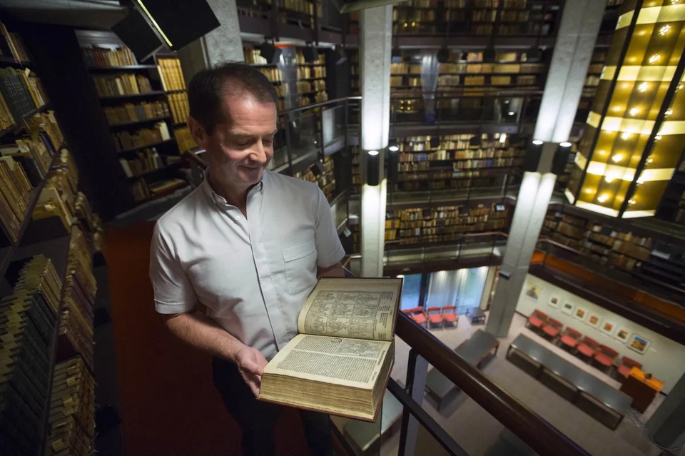 Người thủ thư Pearce Carefoote của thư viện Thomas Fisher, cầm trên tay cuốn Kinh Thánh được xác định đã có từ thời Trung Cổ.