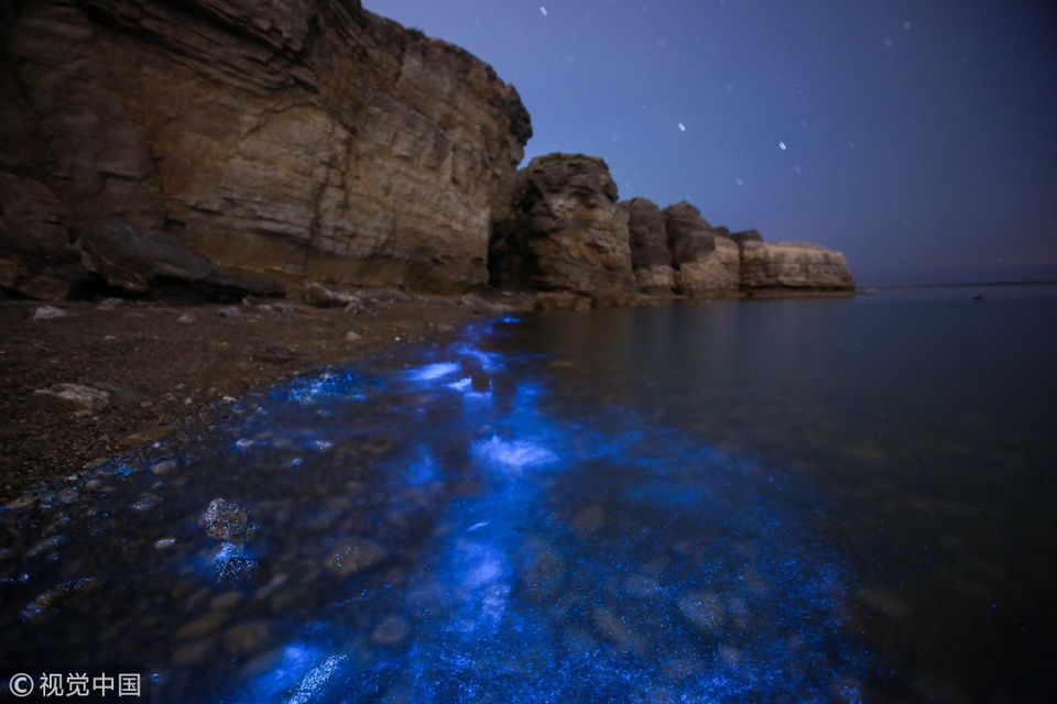 Yellow Sea, Đại Liên, Liêu Ninh, Trung Quốc: Bãi biển ở Đại Liên rực sáng về đêm với ánh sáng xanh lung linh. Theo các chuyên gia, ánh sáng phát ra từ một loại sinh vật phù du gọi là trùng roi khi có những thay đổi nhất định về môi trường. Với hoạt động thủy triều mạnh, khoảng màu xanh trở nên sáng rõ hơn.