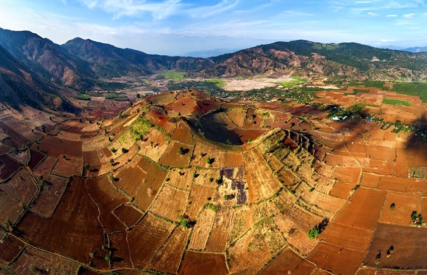 Chư Đăng Ya, Gia Lai: Cảnh quan độc đáo ở Chư Đăng Ya gây ấn tượng với các thửa ruộng bậc thang nhiều kích thước, hình thù đa dạng chắp vá thành chiếc chăn lớn bao phủ toàn khu vực. Núi lửa này đã ngừng hoạt động hàng triệu năm nhưng nham thạch để lại vùng đất đỏ bazan màu mỡ. Thổ nhưỡng ở đây thích hợp cho người dân địa phương trồng trọt nhiều loại cây như ngô, khoai, bí đỏ... Ảnh: Tonkinphotography.