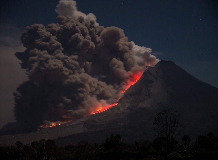Bức ảnh sống động này chụp bởi nhiếp ảnh gia Marc Szeglat. Trong vụ phun trào khác của núi lửa Sinabung vào năm 2014, dòng dung nham đỏ lửa ào ào chảy xuống sườn núi tạo nên những cột tro bụi phun phủ kín khoảng trời. Sinabung “thức giấc” vào tháng 8-2010 sau một thời gian gián đoạn kéo dài hàng thế kỷ và hoạt động liên tục kể từ tháng 9-2013. Ảnh: Marc Szeglat.