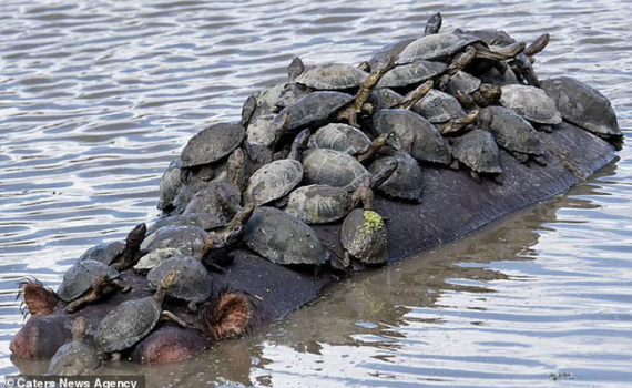 Đàn rùa chen chúc nhau bám lên lưng hà mã khổng lồ để “ đi ké” sang sông - Ảnh 2.