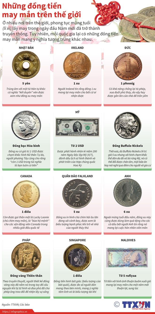 Ở nhiều nơi trên thế giới, phong tục mừng tuổi (lì xì) lấy may trong ngày đầu năm mới đã trở thành truyền thống. Tuy nhiên, mỗi quốc gia lại có những đồng tiền may mắn mang ý nghĩa tượng trưng khác nhau.