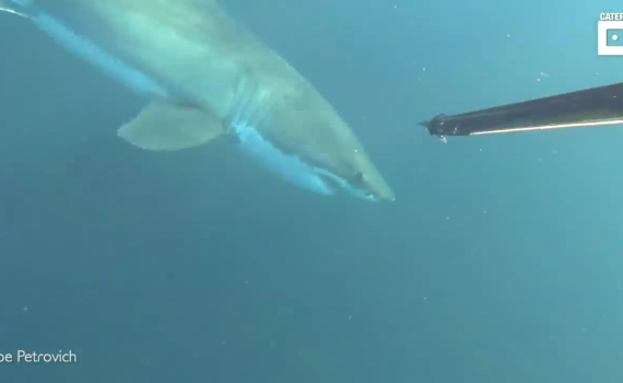 Đoạn video cho thấy cảnh tượng một con cá mập trắng đang tìm cách bao vây và tấn công người thợ lặn với chỉ có một chiếc cần câu súng trong tay.