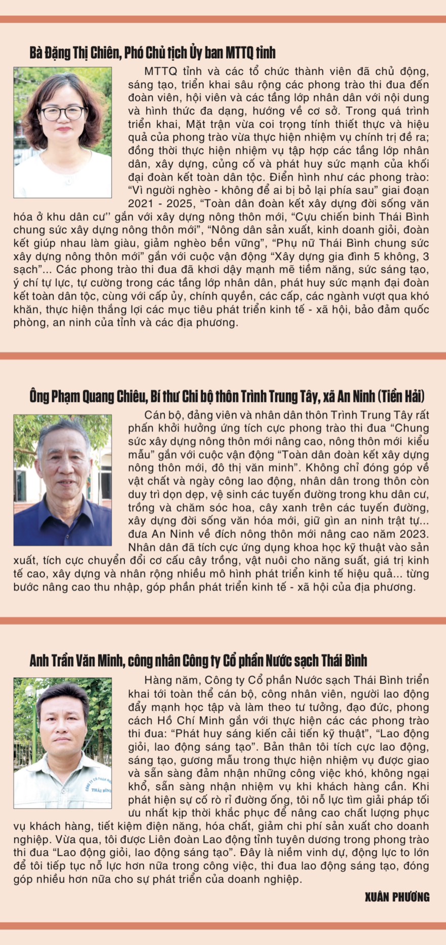 Ông Nguyễn Cảnh Toàn: Được sự quan tâm chỉ đạo của Trung ương, Tỉnh ủy, HĐND, UBND tỉnh cùng với sự vào cuộc chủ động, tích cực của các cơ quan, đơn vị, địa phương, công tác thi đua, khen thưởng của tỉnh thời gian qua đã có những bước chuyển biến rõ nét cả về chất và lượng. Công tác tham mưu, triển khai các phong trào thi đua ngày một hiệu quả, việc hưởng ứng các phong trào do Trung ương phát động luôn thực hiện kịp thời bảo đảm yêu cầu và phù hợp với đặc điểm tình hình của tỉnh. Bên cạnh đó, UBND tỉnh đã tổ chức phát động và triển khai nhiều phong trào thi đua trên nhiều lĩnh vực tập trung vào các khâu yếu, việc khó, các nhiệm vụ chính trị trọng tâm của tỉnh góp phần hoàn thành nhiệm vụ phát triển kinh tế, văn hóa xã hội, an ninh quốc phòng trên địa bàn tỉnh. Điển hình như các phong trào: “Chung sức xây dựng nông thôn mới nâng cao, nông thôn mới kiểu mẫu” giai đoạn 2021 - 2025; “Vì người nghèo - không để ai bị bỏ lại phía sau” giai đoạn 2021 - 2025; “Cán bộ, công chức, viên chức tỉnh Thái Bình thi đua thực hiện văn hóa công sở” giai đoạn 2019 - 2025; “Đẩy mạnh phát triển kết cấu hạ tầng đồng bộ, hiện đại; thực hành tiết kiệm, chống lãng phí” trên địa bàn tỉnh Thái Bình; “Xây dựng xã hội học tập, đẩy mạnh học tập suốt đời” giai đoạn 2023 - 2030; “Đẩy nhanh tiến độ thực hiện giải phóng mặt bằng phục vụ triển khai các dự án đầu tư trên địa bàn tỉnh”; “Tăng cường thu hút đầu tư vào các cụm công nghiệp trên địa bàn tỉnh”; Trách nhiệm, kỷ cương, tăng cường cải cách, tận dụng cơ hội, bứt phá đi lên”; “Trồng cây vụ đông”; “Chuyển đổi số” giai đoạn 2023 - 2025; “Doanh nghiệp sản xuất, kinh doanh giỏi”; “Thi đua lao động, sáng tạo, năng suất, chất lượng, hiệu quả”... Các phong trào thi đua được các tầng lớp nhân dân nhiệt tình hưởng ứng, tạo khí thế thi đua sôi nổi trên địa bàn tỉnh. Bên cạnh việc hưởng ứng các phong trào do Trung ương, do tỉnh phát động, các cơ quan, đơn vị, địa phương cũng tích cực phát động, tổ chức triển khai các phong trào thi đua trong cơ quan, đơn vị, địa phương tạo khí thế thi đua sôi nổi trên mọi mặt của đời sống xã hội.