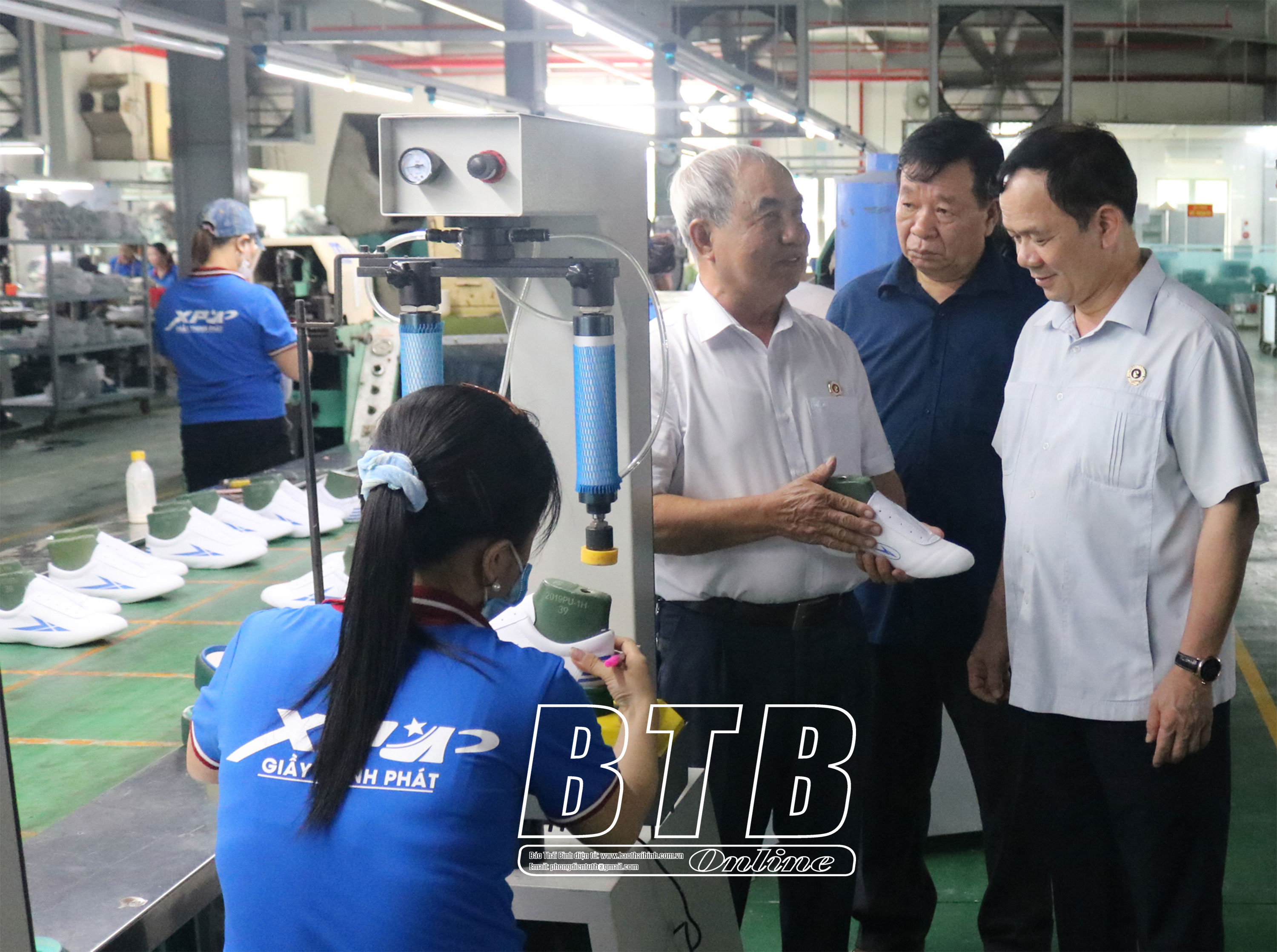 Cựu chiến binh Nguyễn Xuân Phưởng (thứ ba từ phải sang) sản xuất mặt hàng giầy dép xuất khẩu đem lại thu nhập kinh tế cao.