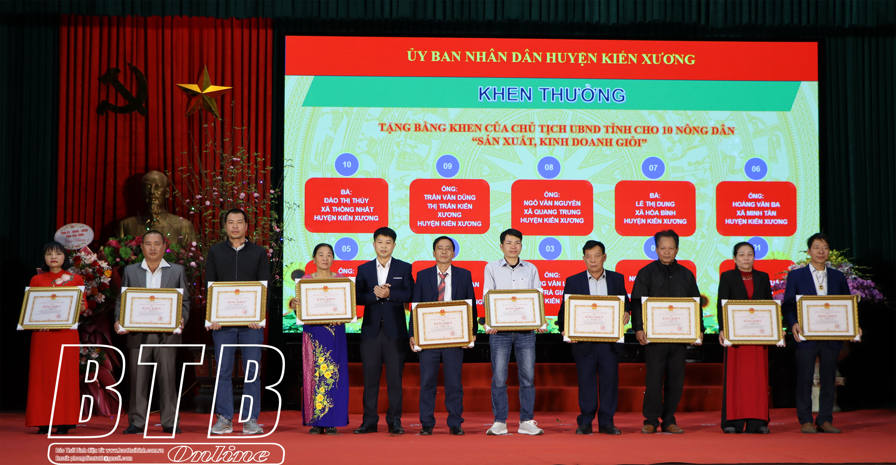 Lãnh đạo huyện Kiến Xương trao bằng khen của Chủ tịch UBND tỉnh cho 10 nông dân sản xuất kinh doanh giỏi.