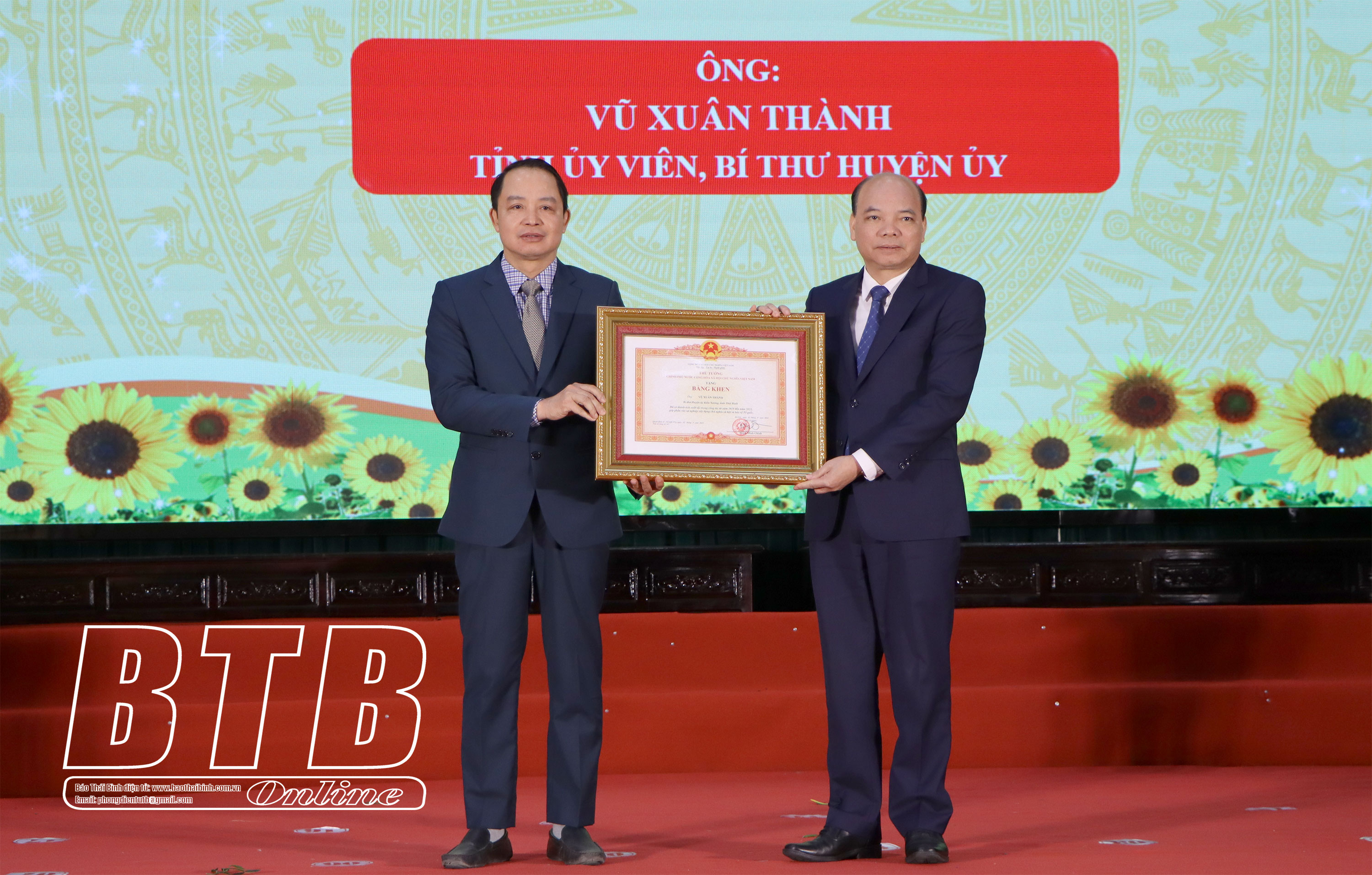 Đồng chí Đặng Thanh Giang, Ủy viên Ban Thường vụ Tỉnh ủy, Phó Chủ tịch thường trực HĐND tỉnh trao bằng khen của Thủ tướng Chính phủ cho đồng chí Vũ Xuân Thành, Tỉnh ủy viên, Bí thư Huyện ủy Kiến Xương.