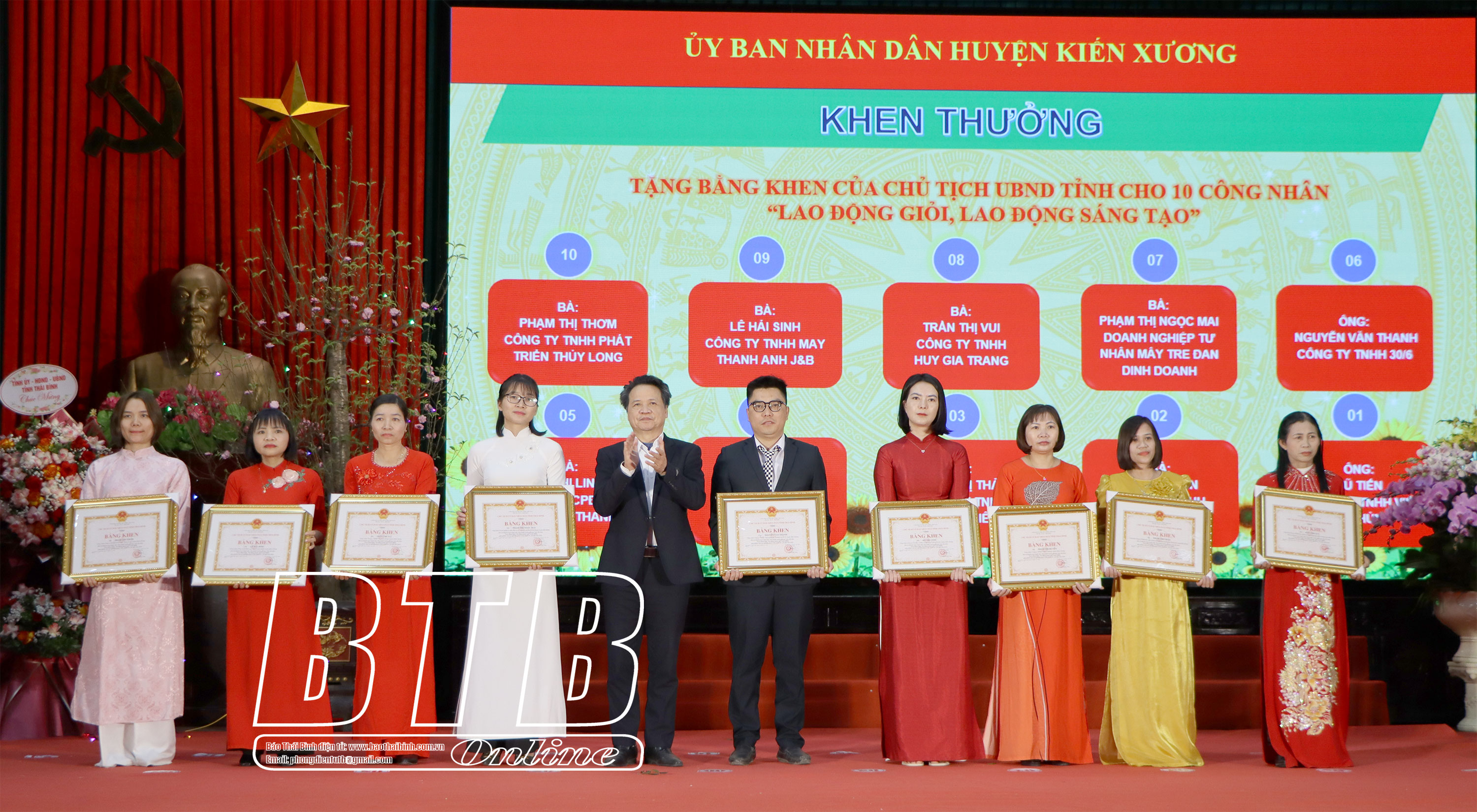 Lãnh đạo huyện Kiến Xương trao bằng khen của Chủ tịch UBND tỉnh cho các công nhân.