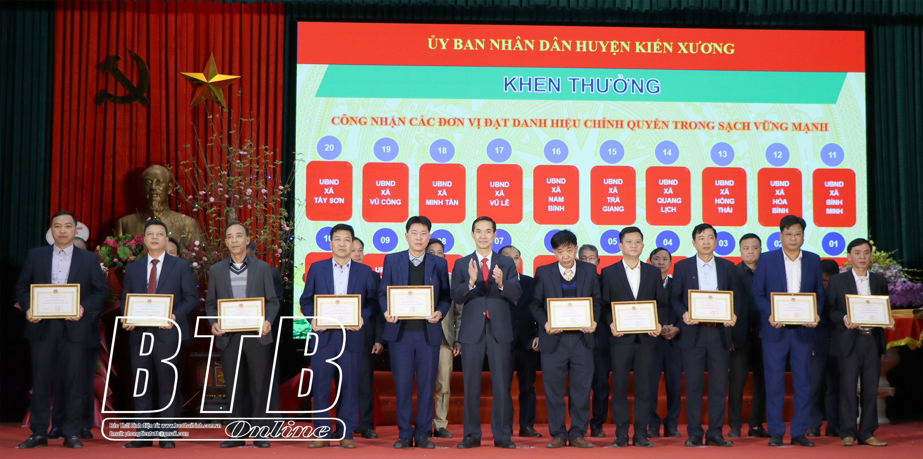 Lãnh đạo huyện Kiến Xương khen thưởng các đơn vị đạt danh hiệu chính quyền trong sạch vững mạnh.