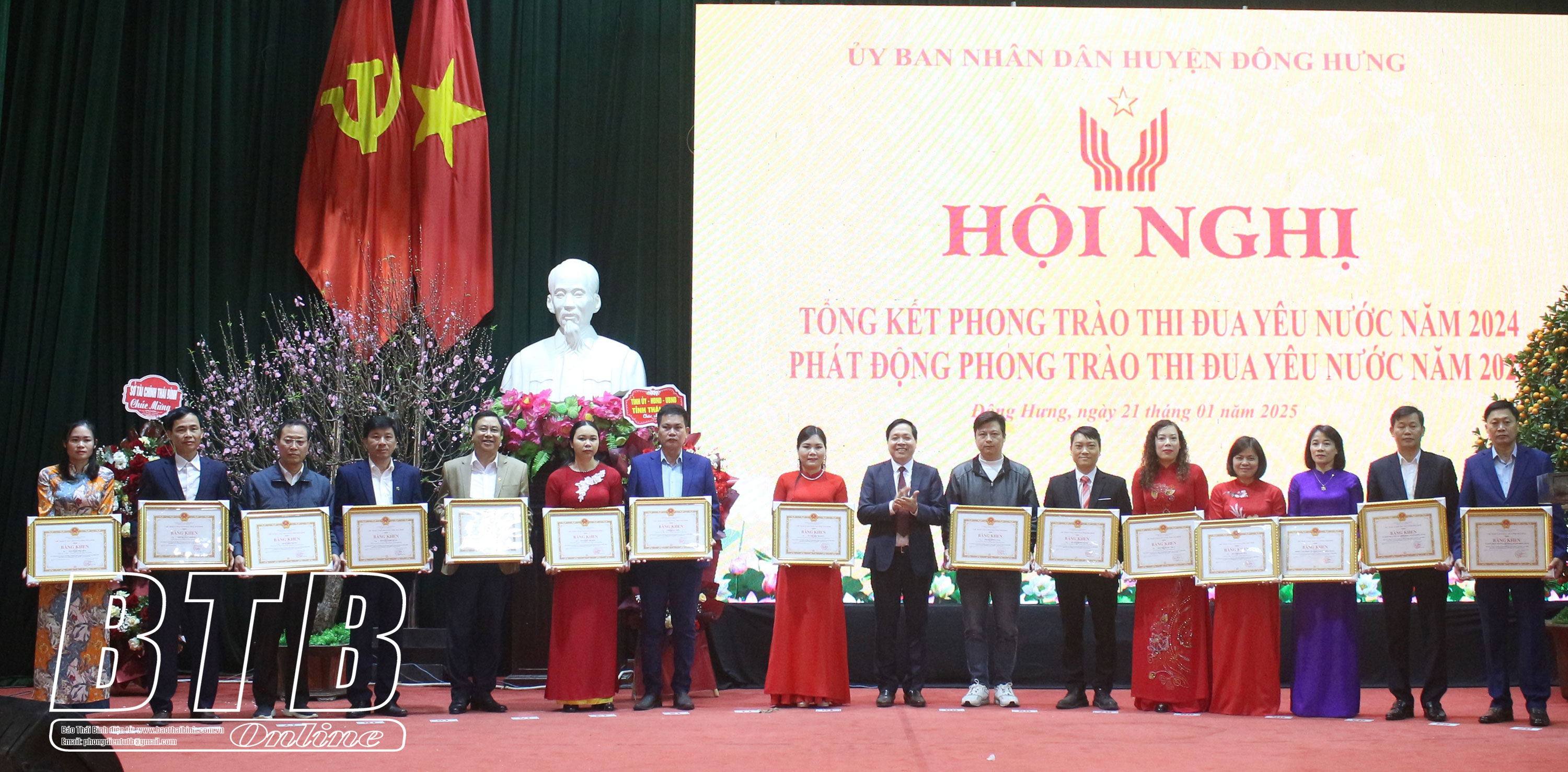 Tại hội nghị, đồng chí Phó Chủ tịch UBND tỉnh đã trao bằng khen của Thủ tướng Chính phủ cho 6 tập thể, cá nhân có thành tích xuất sắc góp phần xây dựng chủ nghĩa xã hội và bảo vệ Tổ quốc; các đồng chí lãnh đạo huyện Đông Hưng trao bằng khen của Chủ tịch UBND tỉnh và giấy khen của Chủ tịch UBND huyện cho các tập thể, cá nhân có thành tích xuất sắc trong phong trào thi đua năm 2024, góp phần phát triển kinh tế - xã hội của tỉnh và huyện Đông Hưng; lãnh đạo huyện Đông Hưng phát động phong trào thi đua năm 2025.
