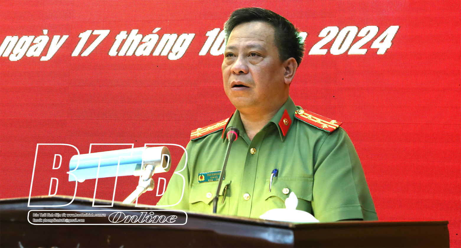 Đại tá Trần Xuân Ánh, Ủy viên Ban Thường vụ Tỉnh ủy, Giám đốc Công an tỉnh phát biểu tại hội nghị.