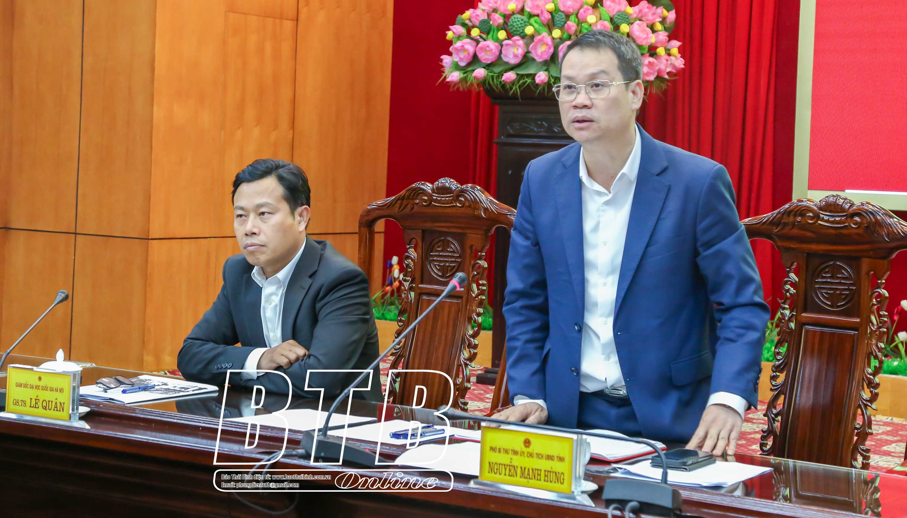 Phát biểu tại buổi làm việc, đồng chí Nguyễn Mạnh Hùng, Phó Bí thư Tỉnh ủy, Chủ tịch UBND tỉnh khẳng định: Thái Bình xác định khoa học, công nghệ, đổi mới sáng tạo và chuyển đổi số là xu hướng tất yếu, là động lực quan trọng cho phát triển kinh tế - xã hội. Để thực hiện hiệu quả các mục tiêu đề ra, tỉnh rất cần sự hỗ trợ từ các viện nghiên cứu, trường đại học uy tín, trong đó có ĐHQGHN.