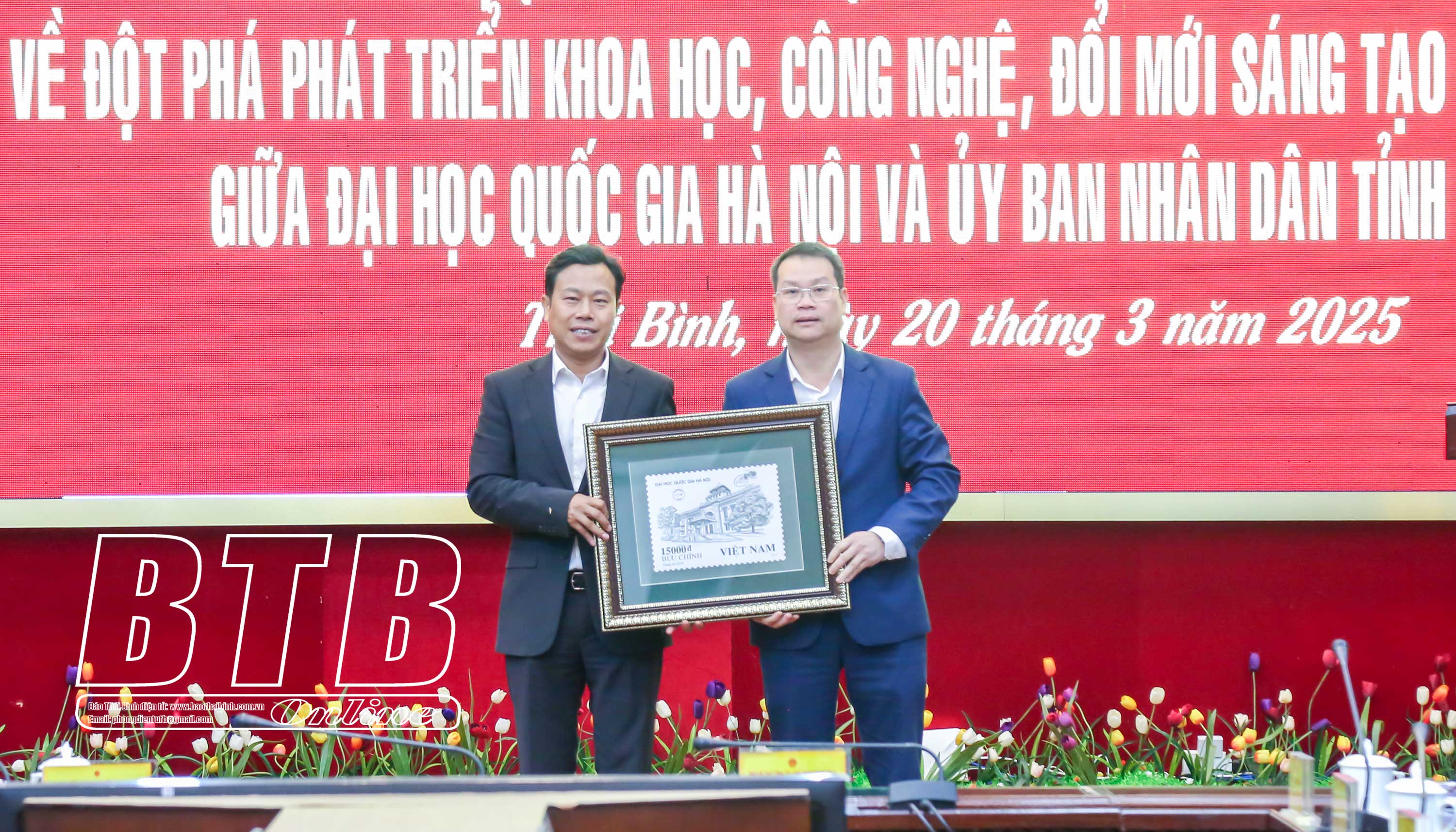 Lãnh đạo Đại học Quốc gia Hà Nội tặng quà lưu niệm lãnh đạo tỉnh Thái Bình.