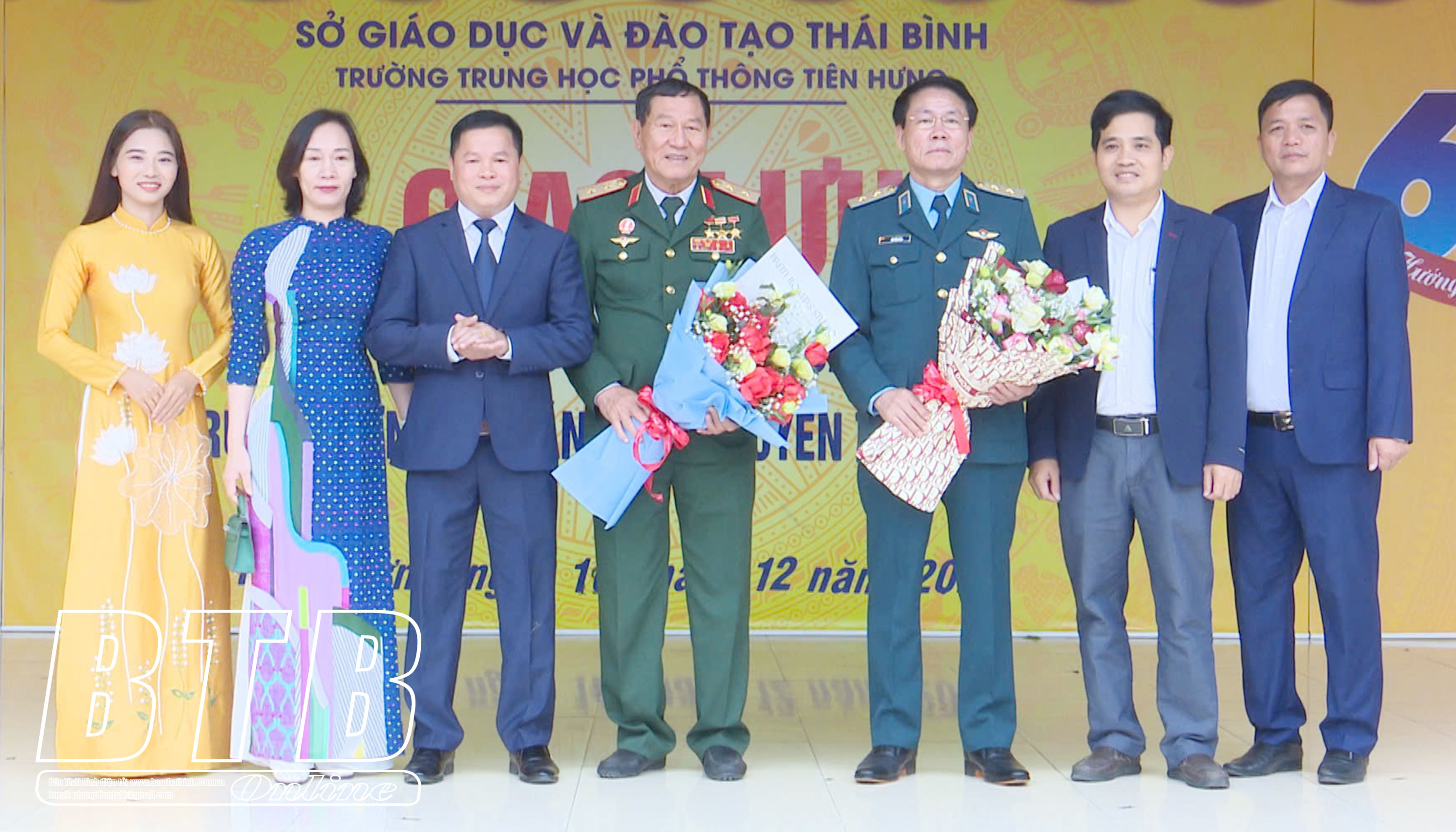 Ban giám hiệu Trường THPT Tiên Hưng tặng hoa và chụp ảnh lưu niệm cùng Trung tướng Phạm Tuân và Trung tướng Vũ Văn Kha tại buổi giao lưu.