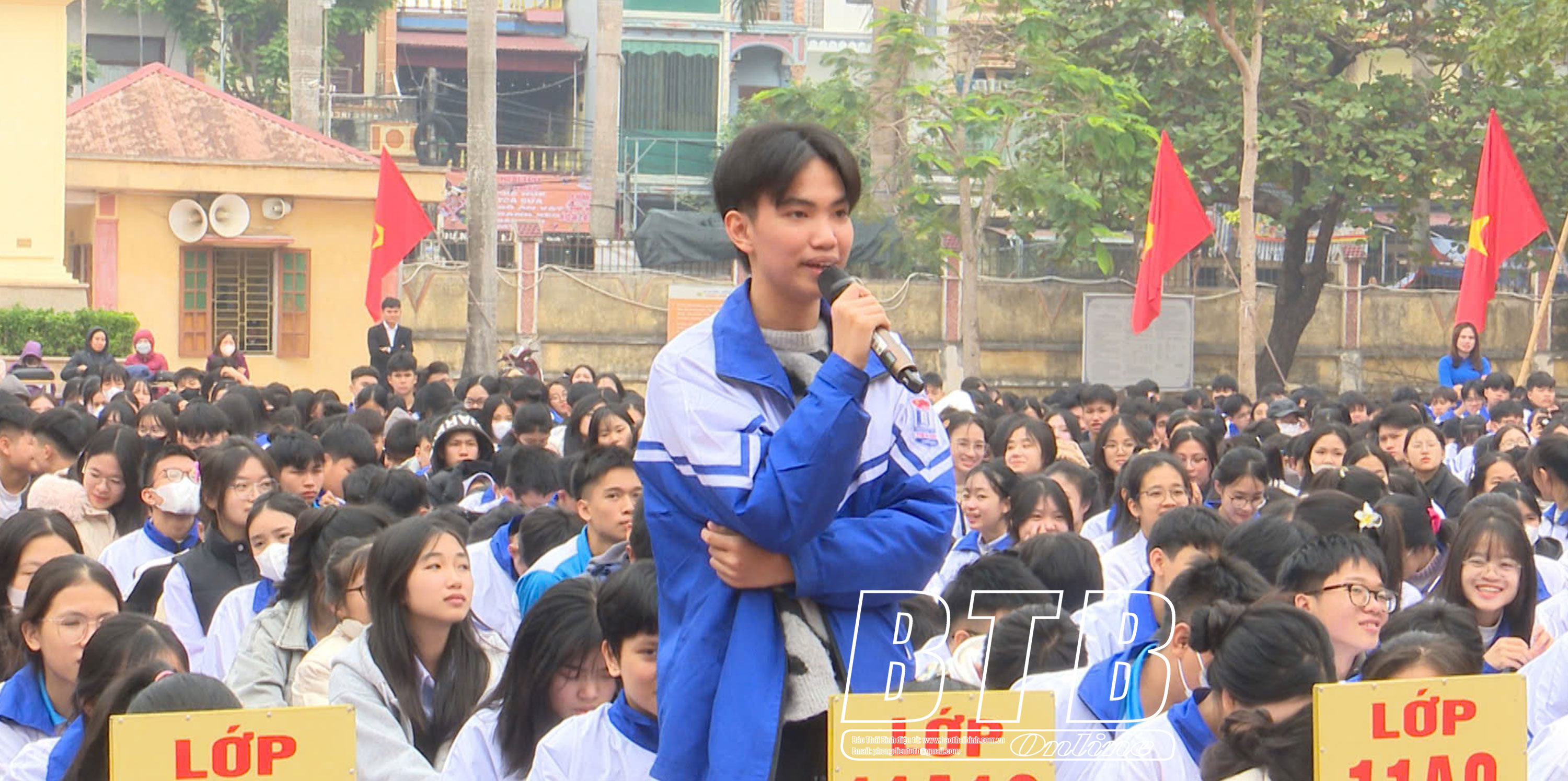 Học sinh Trường THPT Tiên Hưng đặt câu hỏi giao lưu với 2 vị khách mời.