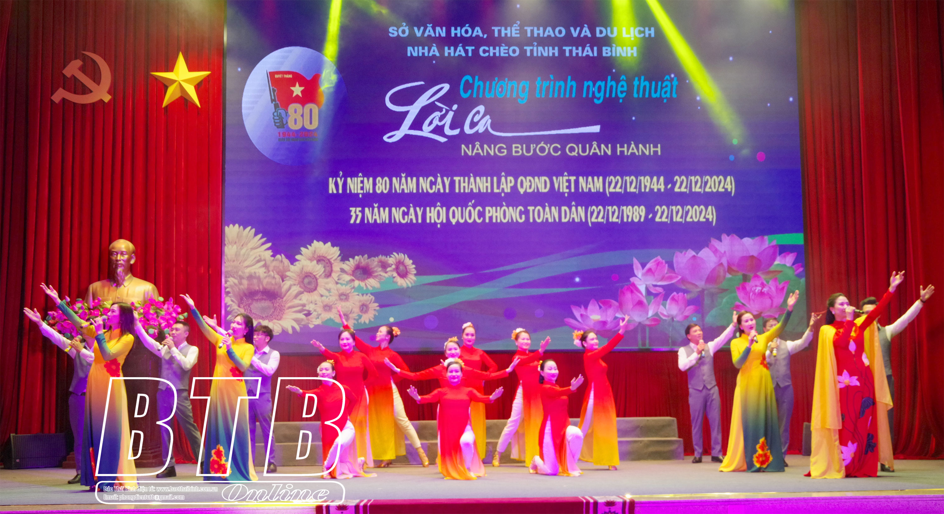 Chương trình văn nghệ với chủ đề “Lời ca nâng bước quân hành” được Nhà hát Chèo Thái Bình dàn dựng công phu với các tiết mục ca, múa nhạc và những làn điệu chèo truyền thống ca ngợi Đảng, Bác Hồ kính yêu, về tình yêu quê hương đất nước và hình ảnh Bộ đội Cụ Hồ… Qua đó đã để lại trong lòng người xem nhiều cung bậc cảm xúc.