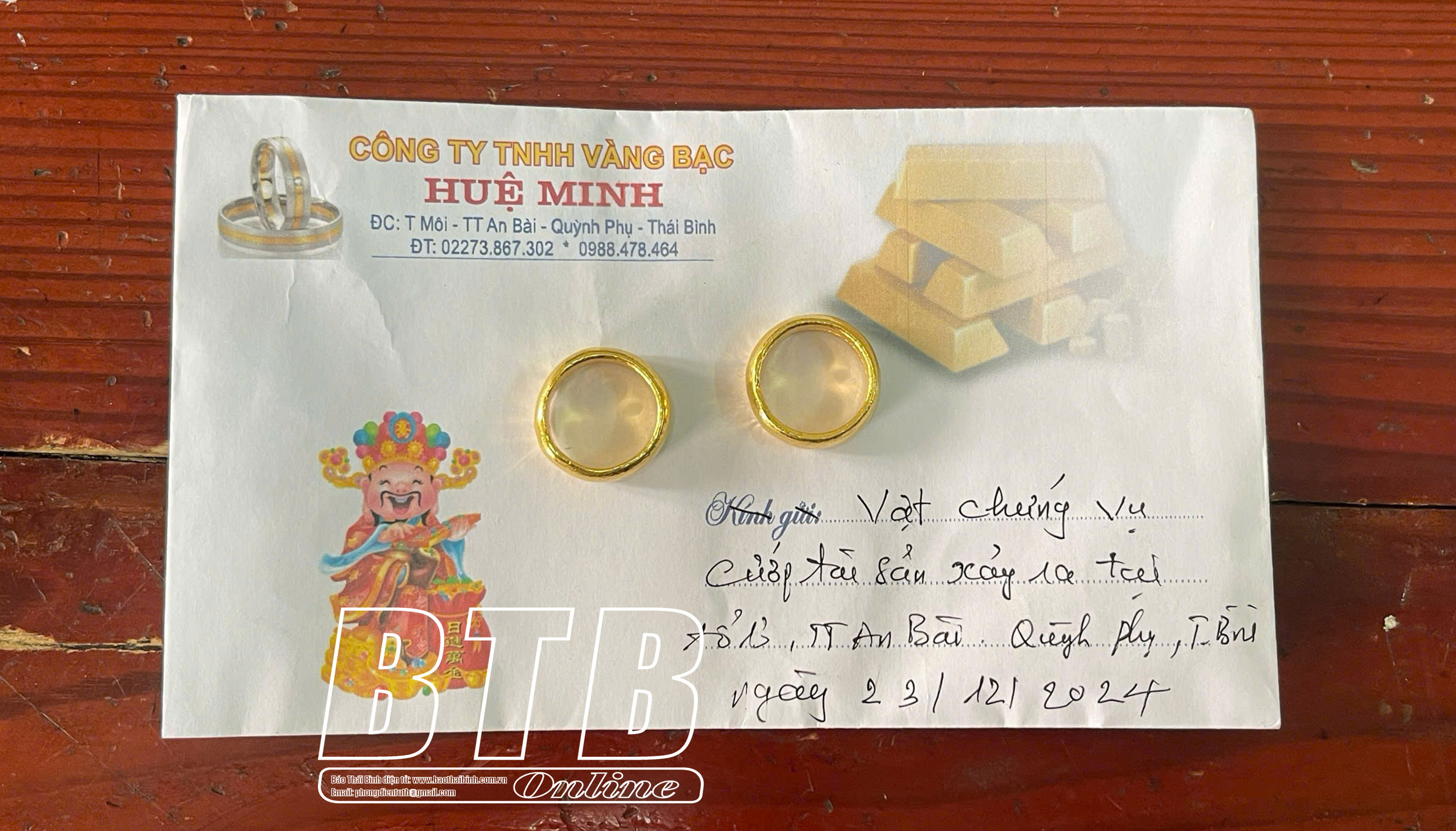 Vào khoảng 18 giờ 30 phút ngày 23/12/2024, Công an huyện Quỳnh Phụ nhận được đơn trình báo của bị hại với nội dung: Khoảng 17 giờ 55 phút ngày 23/12/2024, có một nam thanh niên khoảng 30 tuổi, điều khiển xe mô tô đến cửa hàng vàng bạc Huệ Minh có địa chỉ tại tổ 13, thị trấn An Bài hỏi mua 2 chiếc nhẫn vàng trơn, mỗi chiếc loại 5 chỉ vàng. Bị hại đã lấy từ trong tủ kính 2 chiếc nhẫn trơn, tổng 1 cây vàng (trị giá 84.700.000 đồng) và đưa cho đối tượng. Sau khi nhận vàng từ bị hại, đối tượng đã nhanh chóng cho vào túi áo khoác đang mặc rồi bỏ chạy ra ngoài với ý định lên xe mô tô bỏ trốn, nhưng đã bị chồng bị hại giữ xe lại. Tuy nhiên, đối tượng đã bỏ lại xe mô tô nhãn hiệu Sirius màu sơn đỏ BKS 16M7-7325, sau đó chạy về hướng Hải Phòng.