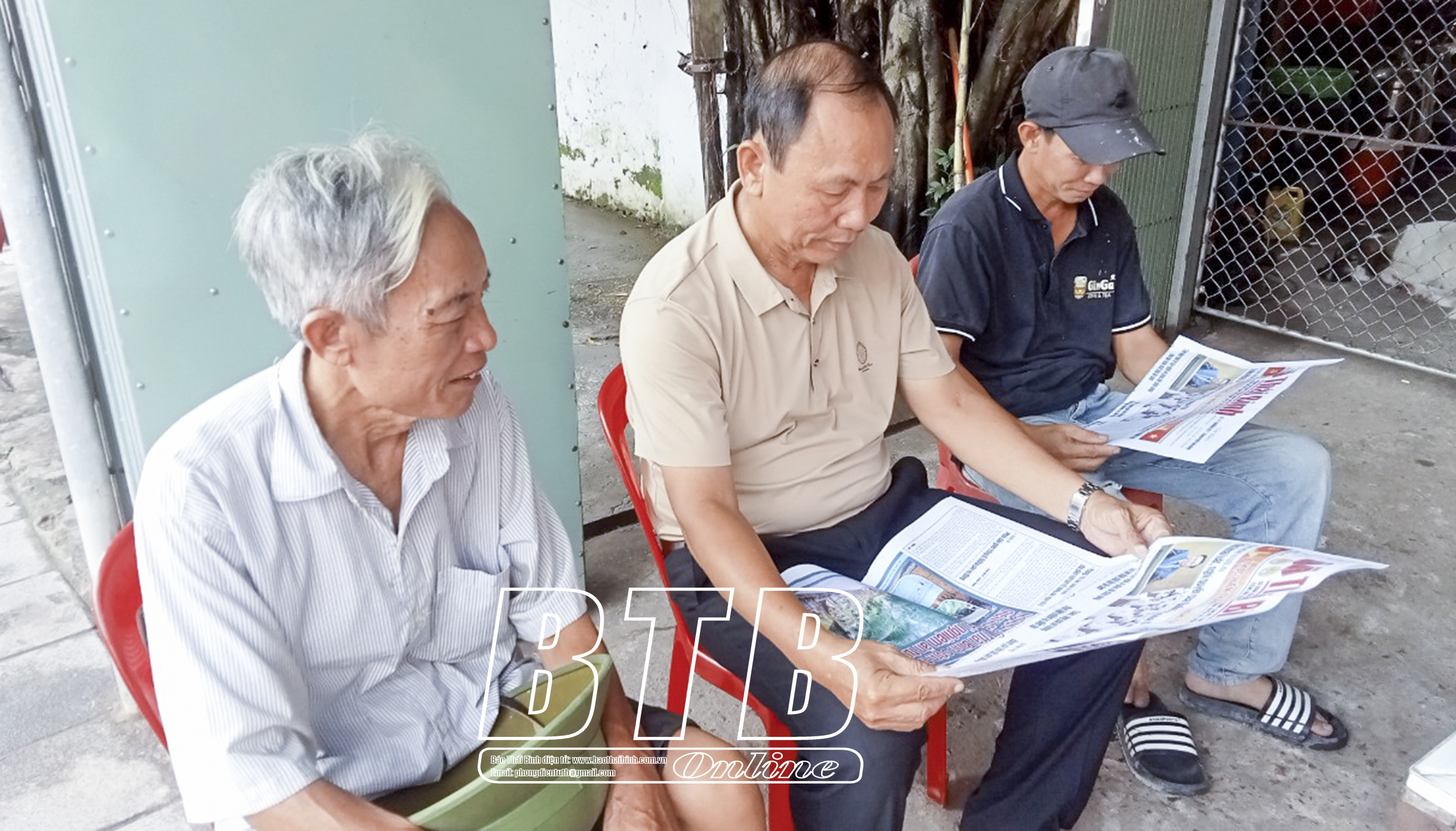 Ông Trương Hoàng Thủy (người ở giữa), xã Nam Thanh và người dân địa phương vẫn giữ thói quen đọc báo Đảng.