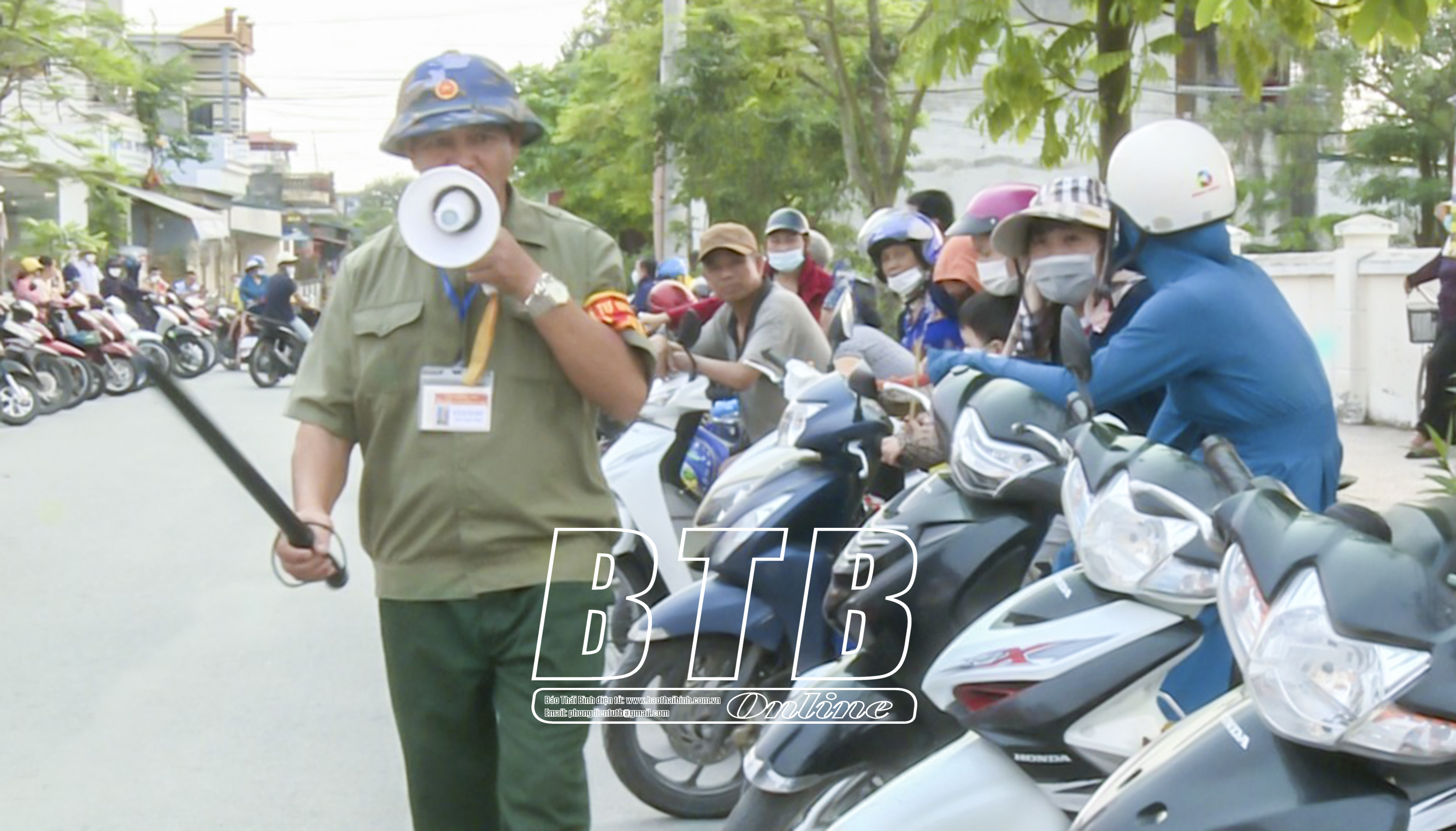Cựu chiến binh Bùi Xuân Nhu, xã An Ninh trong một buổi điều tiết giao thông khu vực cổng Trường Tiểu học và THCS An Ninh.