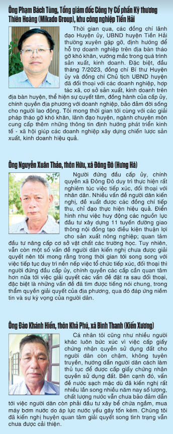 Theo ông Hà Văn Khánh, Bí thư Đảng ủy xã Đông Đô (Hưng Hà): Trong đối thoại, khi đã có sự thống nhất chung thì phải giữ chữ “tín” với dân, theo đuổi đến cùng để giải quyết thấu đáo các vấn đề bởi việc đối thoại không chỉ nhằm giải quyết một công việc cụ thể mà trên hết đó là củng cố niềm tin của nhân dân với cấp ủy, chính quyền. Khi đối thoại phải lắng nghe hết ý kiến để tìm hiểu nguyên nhân và chia sẻ khó khăn với nhân dân. Cái gì làm được thì trả lời làm được, cái gì chưa làm được thì trả lời và xin lỗi dân là chưa làm được, cái gì phải xin ý kiến, chủ trương cấp trên, thuộc cơ chế, chính sách phải giải thích rõ ràng; đồng thời, bộc bạch suy nghĩ, mong muốn của mình để nhân dân hiểu, chia sẻ với cấp ủy, chính quyền, vì mục tiêu phát triển chung của địa phương.