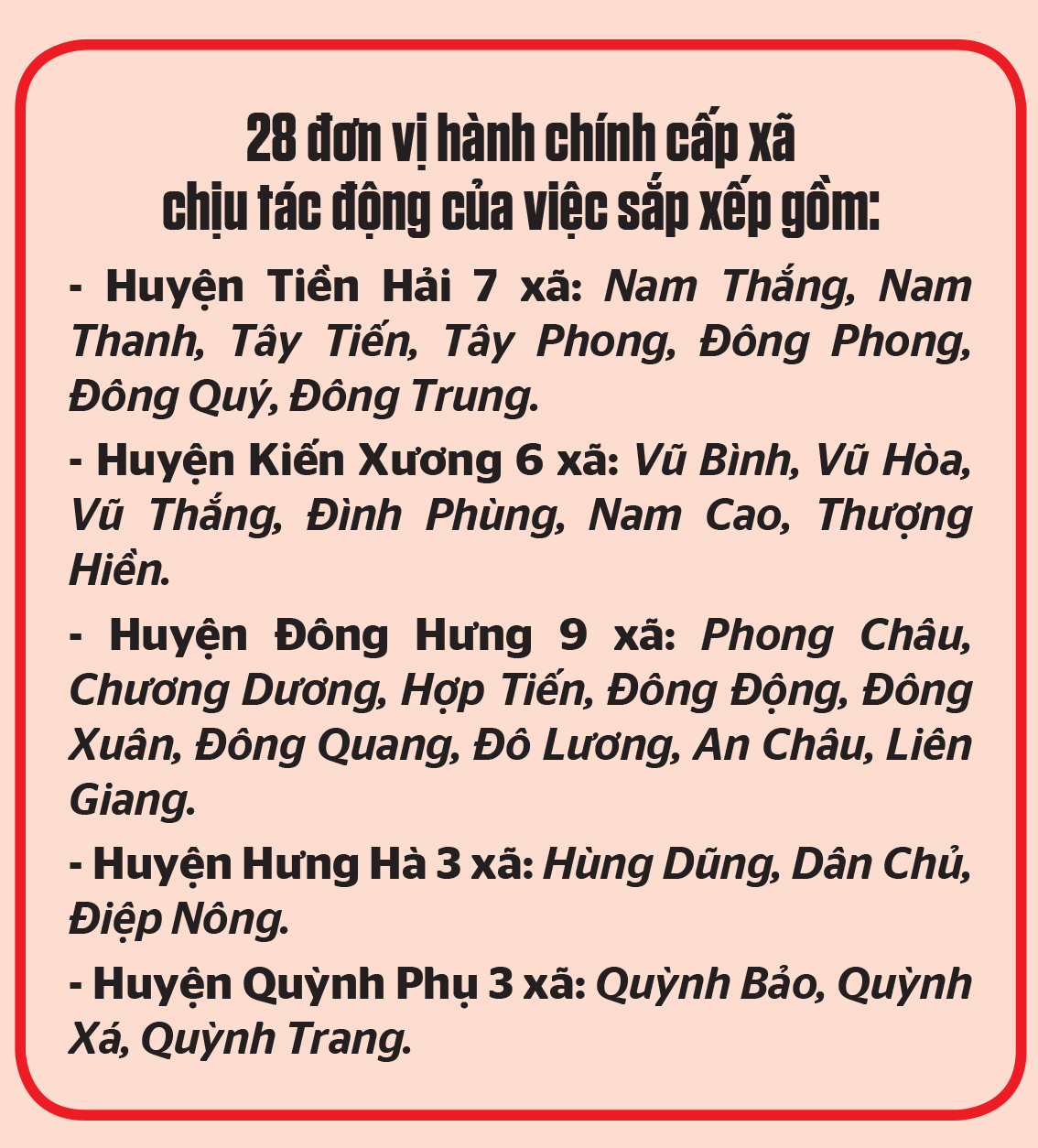 Qua rà soát, giai đoạn 2023 - 2025, toàn tỉnh có 28 đơn vị hành chính cấp xã của các huyện Đông Hưng, Kiến Xương, Quỳnh Phụ, Hưng Hà, Tiền Hải chịu tác động của việc sắp xếp. Trong đó, 17 đơn vị hành chính cấp xã thuộc diện sắp xếp, 11 đơn vị hành chính cấp xã liền kề có điều chỉnh địa giới hành chính khi thực hiện phương án sắp xếp.
