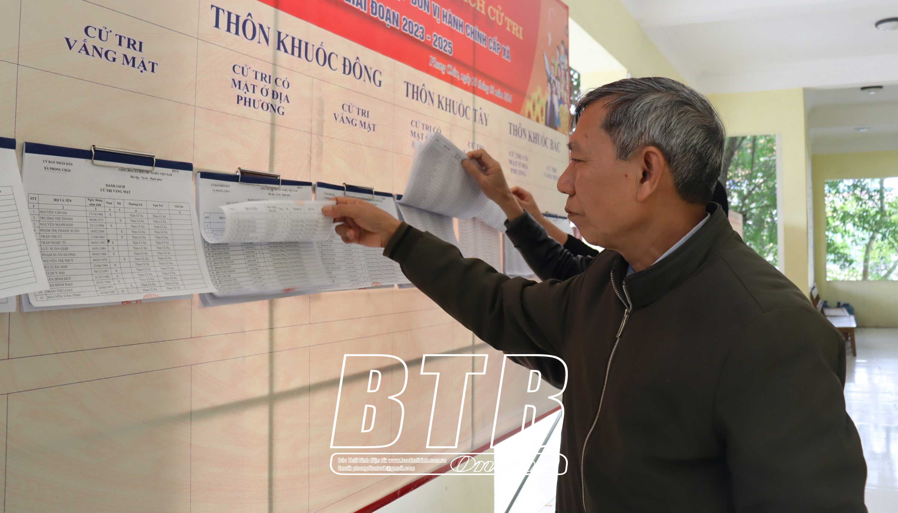 Người dân xã Phong Châu (Đông Hưng) theo dõi danh sách cử tri được niêm yết công khai tại trụ sở UBND xã.