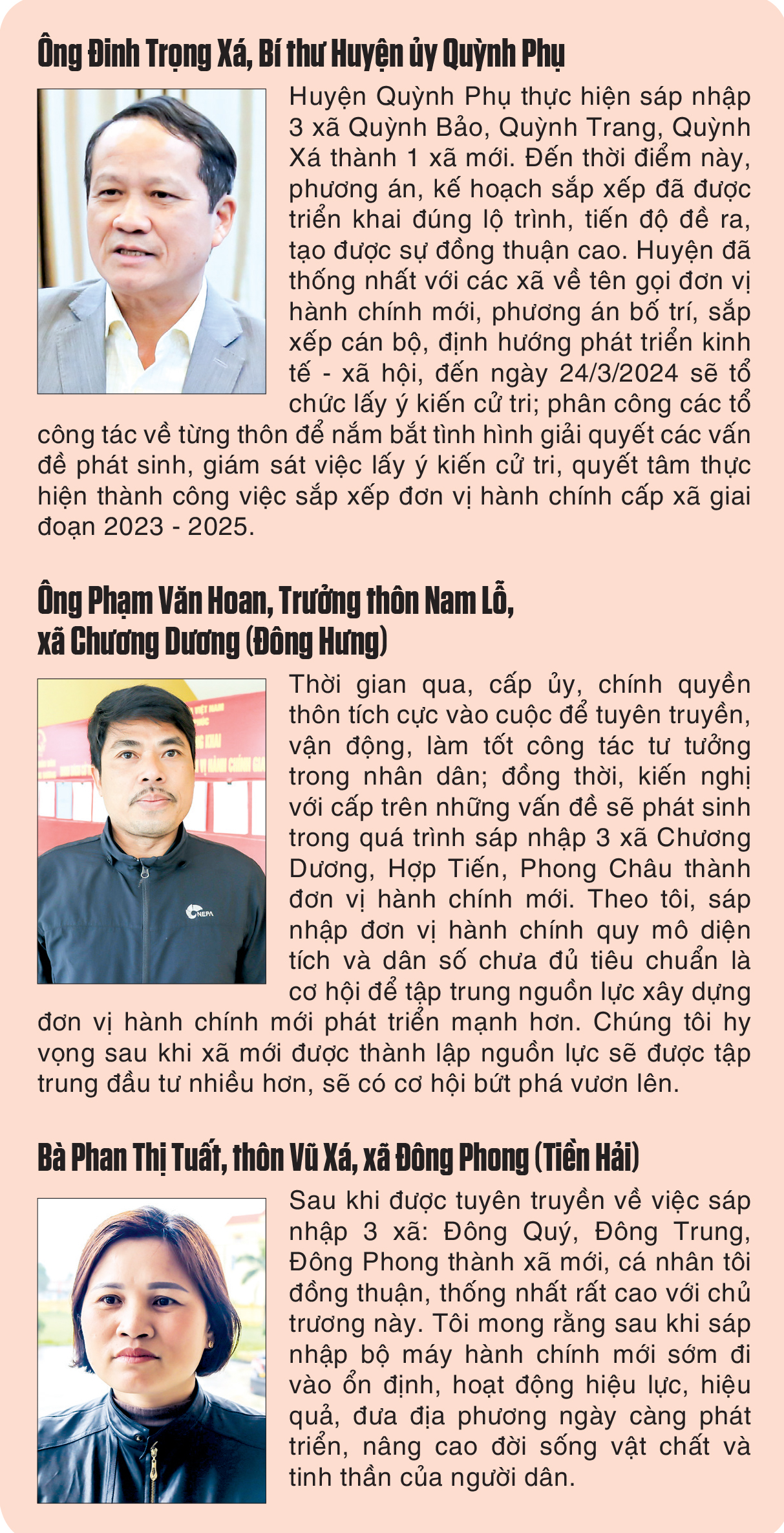 Đến thời điểm này, 7 đơn vị hành chính cấp xã của huyện Tiền Hải trong diện sắp xếp đã hoàn thành việc rà soát và niêm yết danh sách cử tri. Theo ông Hoàng Việt Huy, Phó Chủ tịch UBND huyện: Tiền Hải đã huy động cả hệ thống chính trị vào cuộc để đẩy mạnh tuyên truyền, vận động, trong đó nhấn mạnh đến dự kiến tên gọi, địa điểm đặt trụ sở làm việc, ngày lấy ý kiến cử tri, địa điểm niêm yết danh sách cử tri để cán bộ, đảng viên và nhân dân nắm được chủ trương của Đảng, Nhà nước, của tỉnh, lợi ích của việc sắp xếp đơn vị hành chính cấp xã, từ đó tạo sự đồng thuận, thống nhất cao. Huyện cũng họp với các xã thống nhất tên gọi đơn vị hành chính mới bảo đảm mang ý nghĩa sâu sắc để nhân dân có thêm niềm tin vào sự phát triển của địa phương trong tương lai, còn trụ sở phải đặt ở nơi trung tâm nhất, tạo thuận lợi cho người dân khi tới giao dịch, giải quyết các thủ tục hành chính.