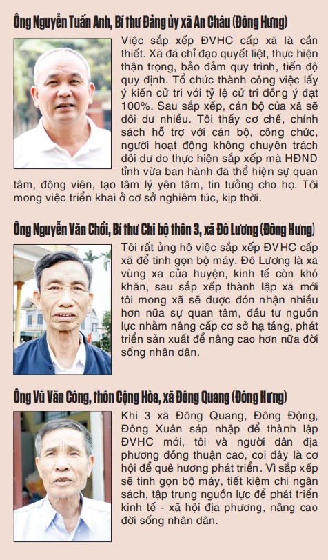 Kỳ họp HĐND tỉnh để giải quyết công việc phát sinh đột xuất được tổ chức trong tháng 5 vừa qua đã thông qua chủ trương sắp xếp ĐVHC cấp xã trên địa bàn tỉnh giai đoạn 2023 - 2025; ban hành nghị quyết quy định chính sách hỗ trợ đối với cán bộ, công chức, viên chức, người hoạt động không chuyên trách dôi dư do thực hiện sắp xếp ĐVHC cấp xã trên địa bàn tỉnh giai đoạn 2023 - 2025. Cùng với các văn bản chỉ đạo của Trung ương, đây là cơ sở pháp lý quan trọng để huyện thực hiện các bước tiếp theo được thuận lợi hơn. Ngay sau khi có nghị quyết phê chuẩn của Ủy ban Thường vụ Quốc hội về sắp xếp ĐVHC cấp xã, huyện Đông Hưng sẽ tổ chức công bố và thực hiện các bước tiếp theo bảo đảm chặt chẽ, bài bản, khoa học. Trong đó, thực hiện tốt việc sắp xếp, bố trí cán bộ, công chức bảo đảm hài hòa, phù hợp với năng lực công tác và vị trí việc làm, yêu cầu thực tiễn của từng địa phương. Với sự chuẩn bị từ sớm, từ xa, hầu hết cán bộ, công chức dôi dư, địa phương có phương án, vị trí công việc cụ thể để bố trí, sắp xếp bảo đảm phù hợp. Huyện cũng sẽ tập trung giải quyết chế độ, chính sách cho cán bộ dôi dư theo đúng quy định.
