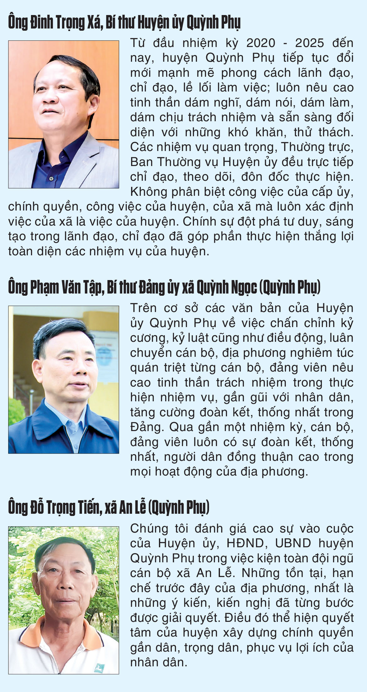 Từ năm 2021 đến nay, Huyện ủy Quỳnh Phụ đã ban hành một số văn bản về công tác cán bộ: Kế hoạch số 38 về việc luân chuyển, điều động cán bộ diện Ban Thường vụ Huyện ủy quản lý và điều động cán bộ, công chức cấp huyện, cấp xã giai đoạn 2021 - 2025; Công văn số 262 về việc chấn chỉnh kỷ luật, kỷ cương hành chính, đạo đức công vụ của cán bộ, công chức, viên chức trên địa bàn huyện; Thông báo kết luận số 423 về sắp xếp đội ngũ công chức cấp xã bảo đảm tinh gọn, hợp lý, hiệu lực, hiệu quả... Cùng với ban hành văn bản, công tác kiểm tra, giám sát được triển khai thực hiện nghiêm túc. Trong năm 2023, cấp ủy hai cấp thực hiện 133 cuộc kiểm tra đối với 138 tổ chức đảng và 401 đảng viên; chi bộ cơ sở thực hiện 9 cuộc kiểm tra đối với 17 đảng viên... Qua kiểm tra, giám sát đã kịp thời phát hiện và xử lý một số cán bộ, công chức, viên chức vi phạm. Tính đến năm 2023, ủy ban kiểm tra hai cấp, các cấp ủy và chi bộ đã thi hành kỷ luật 62 đảng viên do vi phạm chính sách dân số và những điều đảng viên không được làm, trong thực hiện quy chế, quy định và trong thực hiện nhiệm vụ của đảng viên; tổ chức luân chuyển, sắp xếp công tác 49 công chức cấp xã, bảo đảm hoạt động thông suốt, hiệu quả. Từ chỉ đạo quyết liệt của Huyện ủy Quỳnh Phụ đã mang lại sự thống nhất, đoàn kết ngay từ cơ sở, giúp nhiều địa phương có sự chuyển biến mạnh mẽ.
