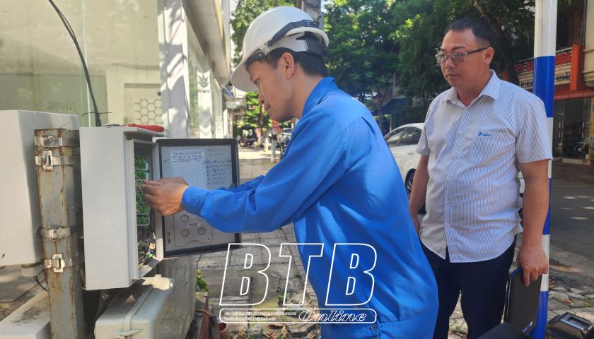 Công nhân VNPT thành phố Thái Bình kiểm tra hệ thống cáp viễn thông đã được hạ ngầm tại tuyến phố Bồ Xuyên.