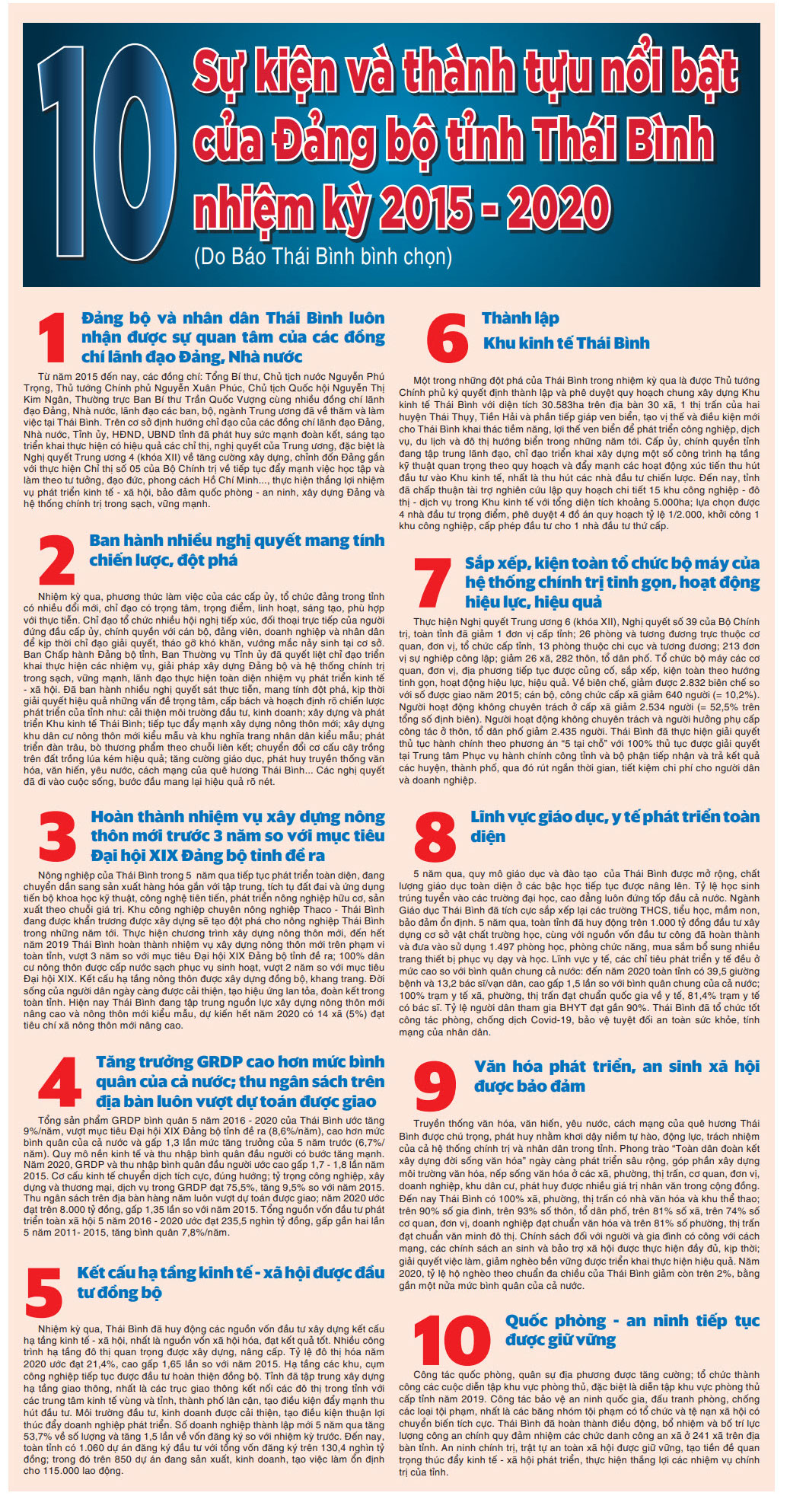 10 sự kiện và thành tựu nổi bật của Đảng bộ tỉnh Thái Bình nhiệm kỳ 2015 - 2020 (Do Báo Thái Bình bình chọn)