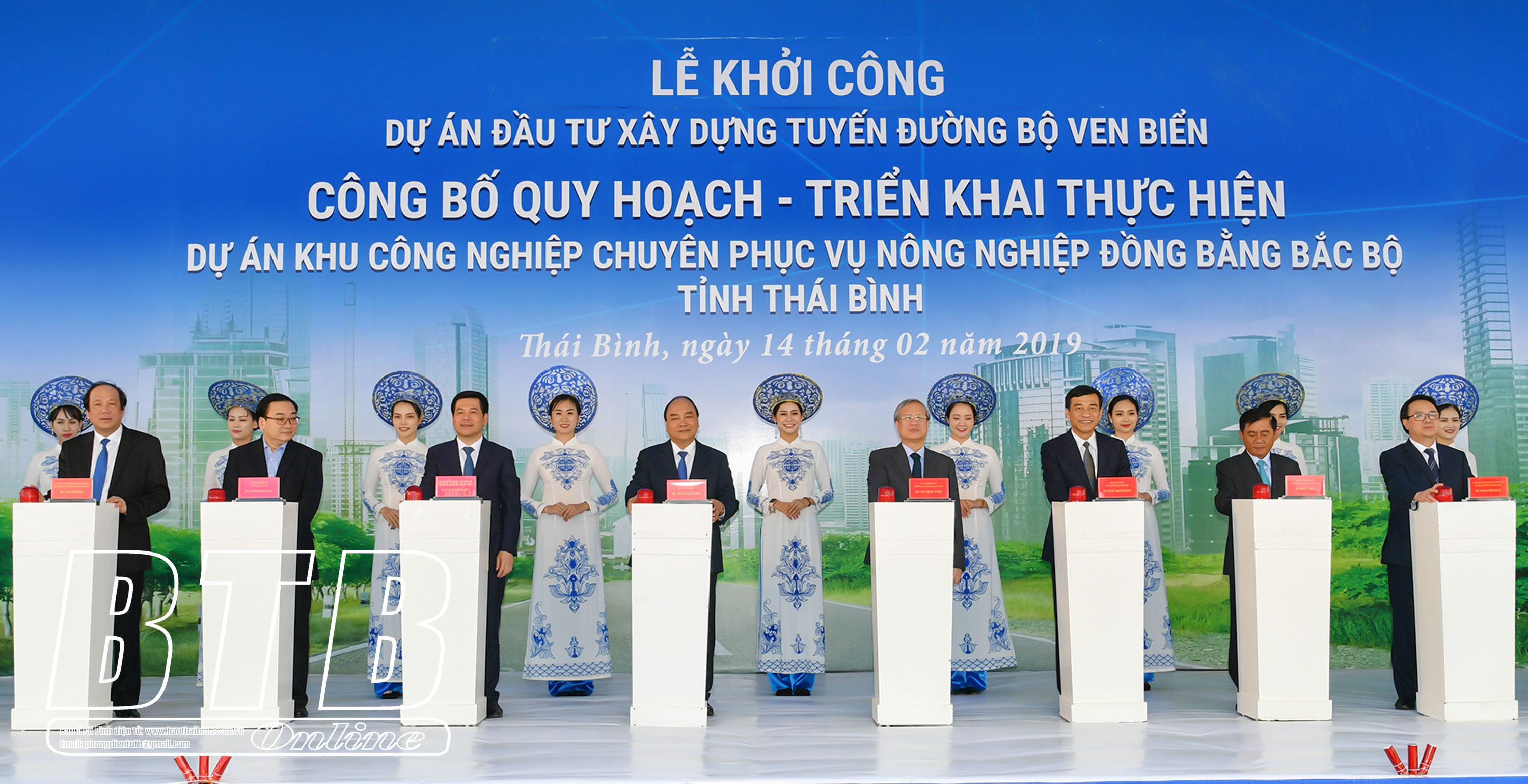 Các đồng chí: Nguyễn Xuân Phúc, Ủy viên Bộ Chính trị, Thủ tướng Chính phủ; Trần Quốc Vượng, Ủy viên Bộ Chính trị, Thường trực Ban Bí thư cùng các đồng chí lãnh đạo Đảng, Nhà nước, lãnh đạo tỉnh phát lệnh khởi công dự án đầu tư xây dựng tuyến đường bộ ven biển tỉnh Thái Bình, ngày 14/2/2019.