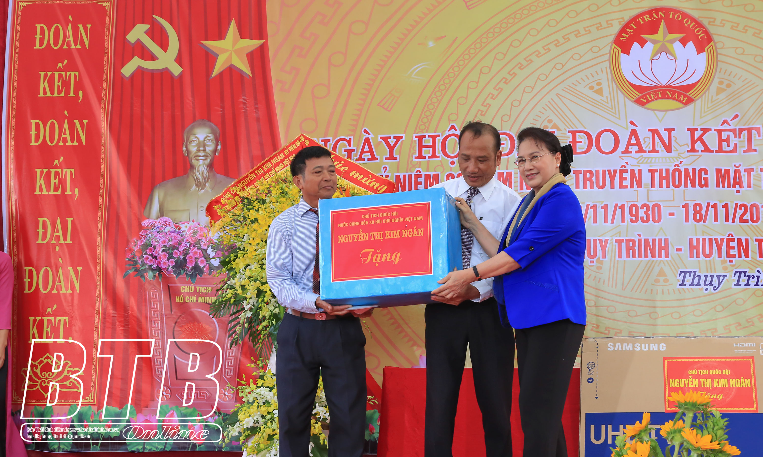 Đồng chí Nguyễn Thị Kim Ngân, Ủy viên Bộ Chính trị, Chủ tịch Quốc hội tặng quà cán bộ, nhân dân thôn Nam Ô Trình, xã Thụy Trình (Thái Thụy), ngày 17/11/2018.