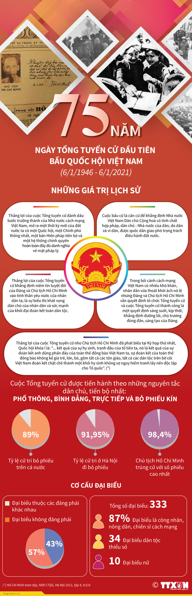 Ngày 6/1/1946 đánh dấu một sự kiện quan trọng trong lịch sử nước ta khi lần đầu tiên người dân Việt Nam thông qua lá phiếu của mình được quyền trực tiếp lựa chọn, bầu những người có tài, có đức vào Quốc hội để gách vác công việc nước nhà. Thành công của cuộc Tổng tuyển cử đã đánh dấu sự ra đời của Quốc hội nước Việt Nam Dân chủ Cộng hòa, ngày nay là Quốc hội nước Cộng hòa xã hội chủ nghĩa Việt Nam