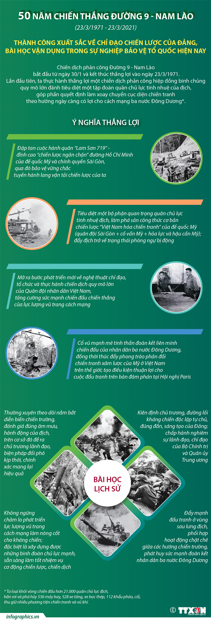 Chiến dịch phản công Đường 9 - Nam Lào bắt đầu từ ngày 30/1 và kết thúc thắng lợi vào ngày 23/3/1971. Lần đầu tiên, ta thực hành thắng lợi một chiến dịch phản công hiệp đồng binh chủng quy mô lớn đánh tiêu diệt một tập đoàn quân chủ lực tinh nhuệ của địch, góp phần quyết định làm xoay chuyển cục diện chiến tranh theo hướng ngày càng có lợi cho cách mạng ba nước Đông Dương.