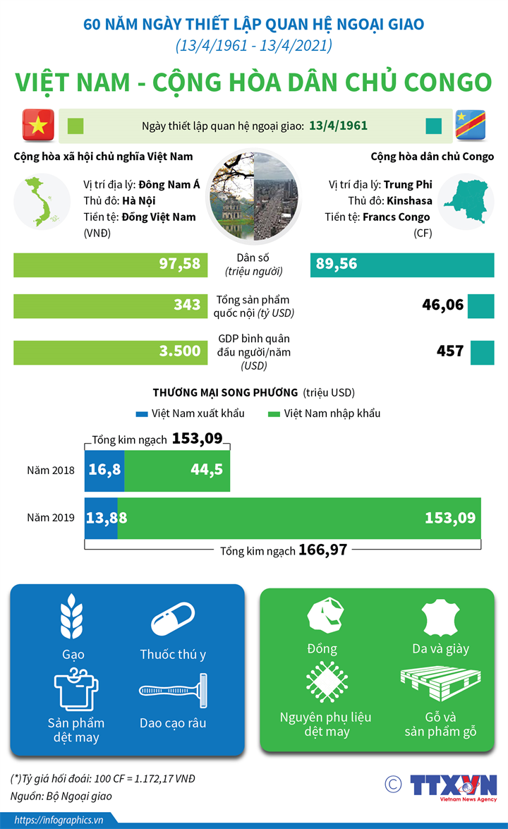 60 năm qua (13/4/1961 - 13/4/2021), quan hệ giữa 2 nước Việt Nam và CHDC Congo có bước phát triển. Tuy nhiên, quan hệ thương mại và hợp tác đầu tư giữa hai nước vẫn còn nhiều tiềm năng chưa được khai thác.