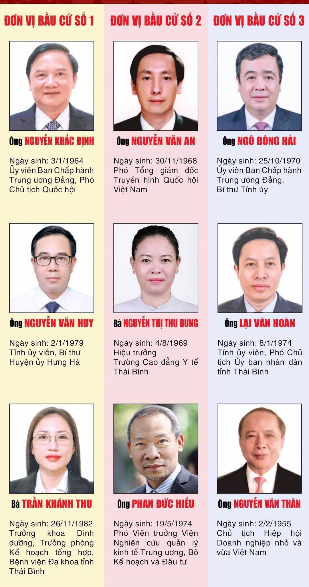 Chiều 10/6, thay mặt Hội đồng bầu cử quốc gia, Chủ tịch Hội đồng bầu cử quốc gia - Chủ tịch Quốc hội Vương Đình Huệ đã ký Nghị quyết số 748 /NQ-HĐBCQG về việc công bố kết quả bầu cử và danh sách 499 người trúng cử đại biểu Quốc hội khóa XV. Trong đó, có 9 người trúng cử đại biểu Quốc hội khóa XV tại 3 đơn vị bầu cử của tỉnh Thái Bình.