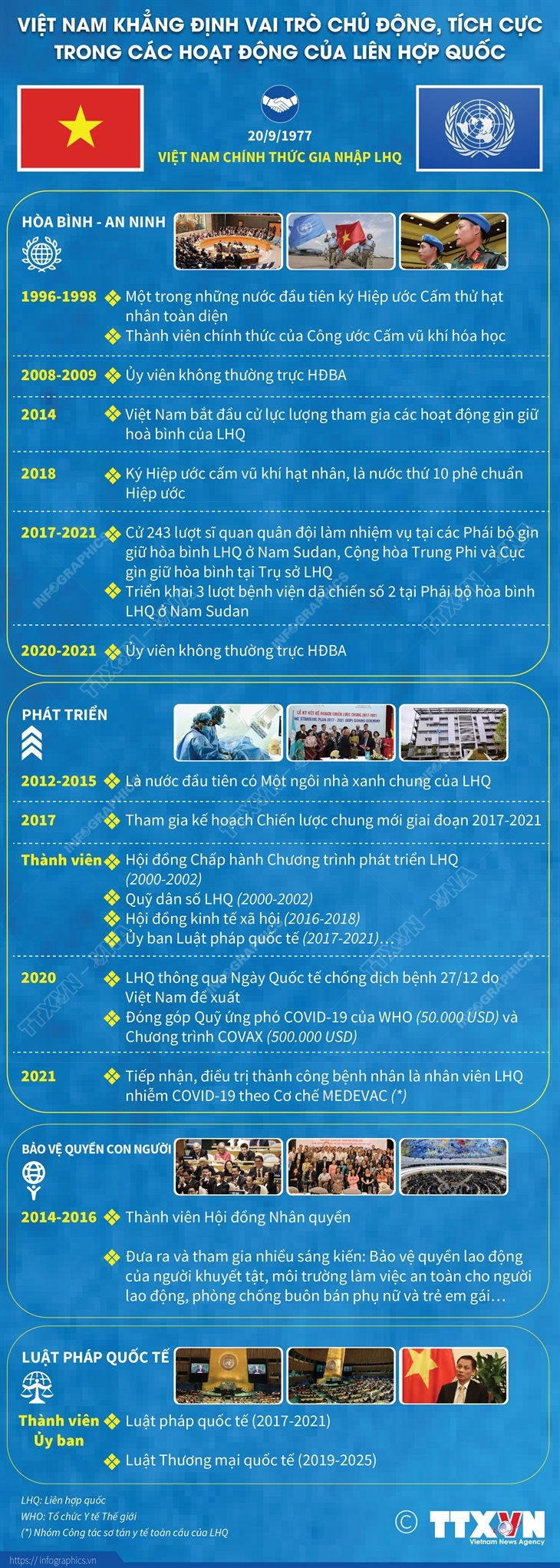 Ngày 20/9/1977, Việt Nam chính thức gia nhập Liên hợp quốc. Quan hệ hợp tác Việt Nam và Liên hợp quốc trong hơn 40 năm qua đã góp phần bảo vệ và thúc đẩy lợi ích quốc gia-dân tộc của Việt Nam, nhất là duy trì, củng cố môi trường hòa bình, an ninh và thuận lợi cho phát triển đất nước. Mặt khác, Việt Nam cũng chủ động đóng góp tích cực và ngày càng thực chất đối với các hoạt động của Liên hợp quốc.