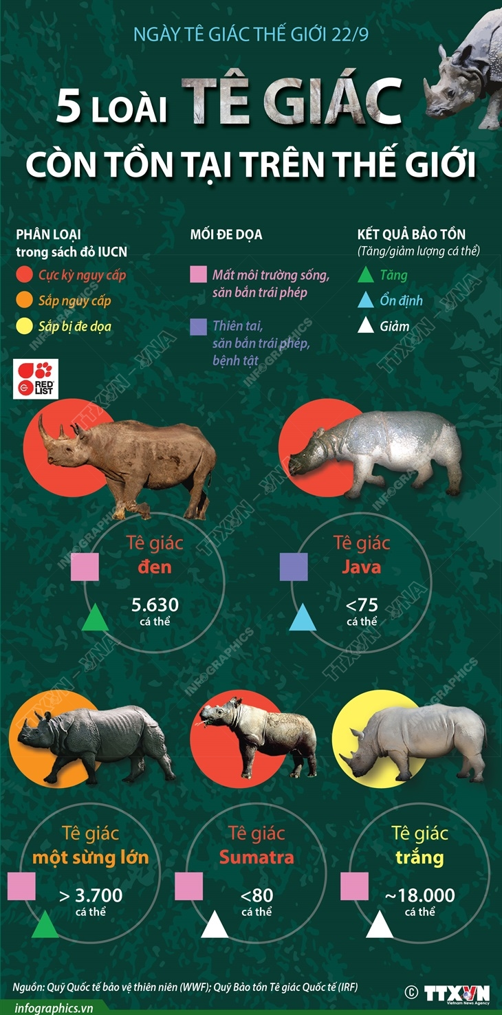 Thế giới hiện có 5 loài tê giác, 3 trong số đó đang trong tình trạng cực kỳ nguy cấp. Những nỗ lực bảo tồn tê giác đạt được một số kết quả nhất định, song chưa đủ để giữ cho số lượng loài tê giác cực kỳ nguy cấp Sumatra khỏi bị suy giảm.