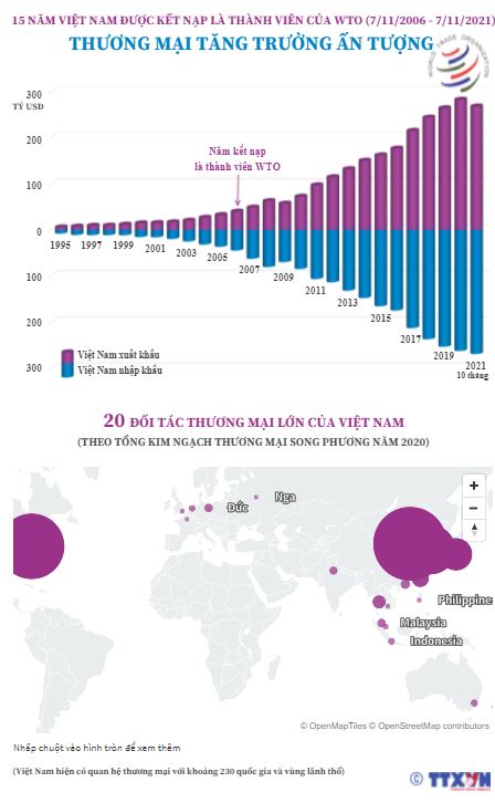 Năm 2021 đánh dấu 15 năm Việt Nam được kết nạp là thành viên của Tổ chức Thương mại Thế giới - WTO (7/11/2006 - 7/11/2021). Qua 15 năm, tổng kim ngạch xuất nhập khẩu của Việt Nam chứng kiến sự tăng trưởng ấn tượng, tính đến hết năm 2020 đã tăng gấp gần 5 lần so với năm 2006 và vượt mốc 540 tỷ USD.