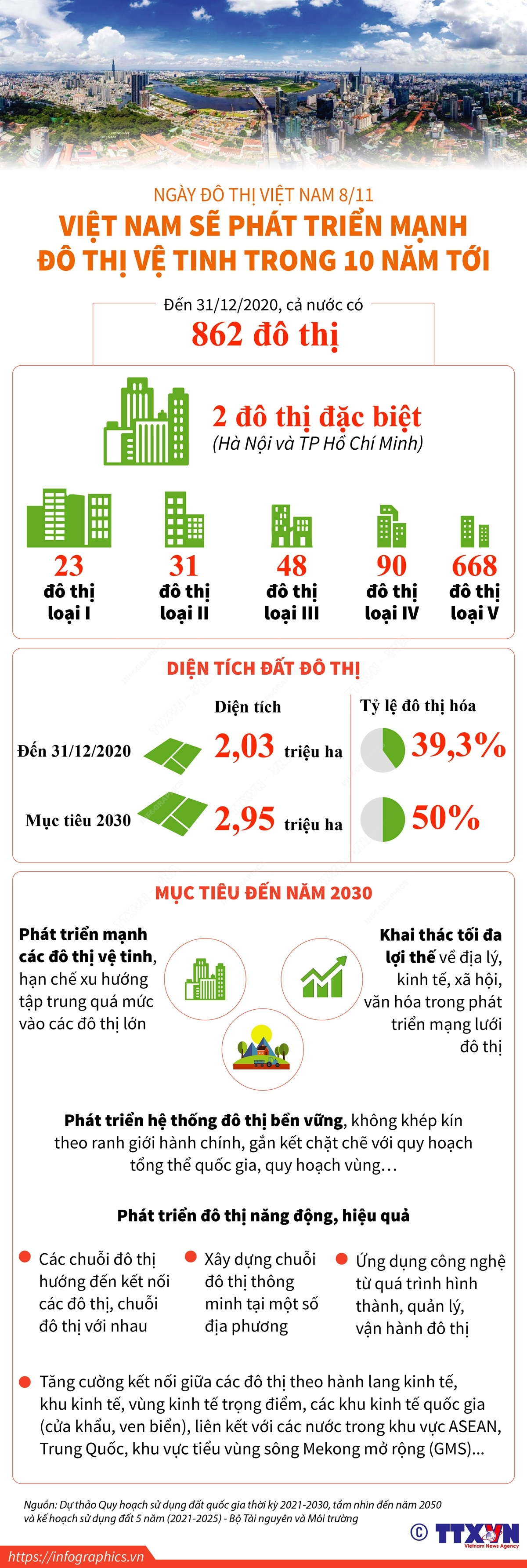 Ngày 8/11 hằng năm được chọn là “Ngày Đô thị Việt Nam” nhằm tôn vinh sự nghiệp quy hoạch và phát triển đô thị cả nước, tạo sự quan tâm chung của toàn xã hội đối với công tác quy hoạch và phát triển đô thị. Theo quy hoạch đến năm 2030, Việt Nam đặt mục tiêu phát triển hệ thống đô thị bền vững, năng động, hiệu quả đặc biệt phát triển mạnh đô thị vệ tinh gắn kết chặt chẽ với quy hoạch tổng thể quốc gia, quy hoạch vùng.